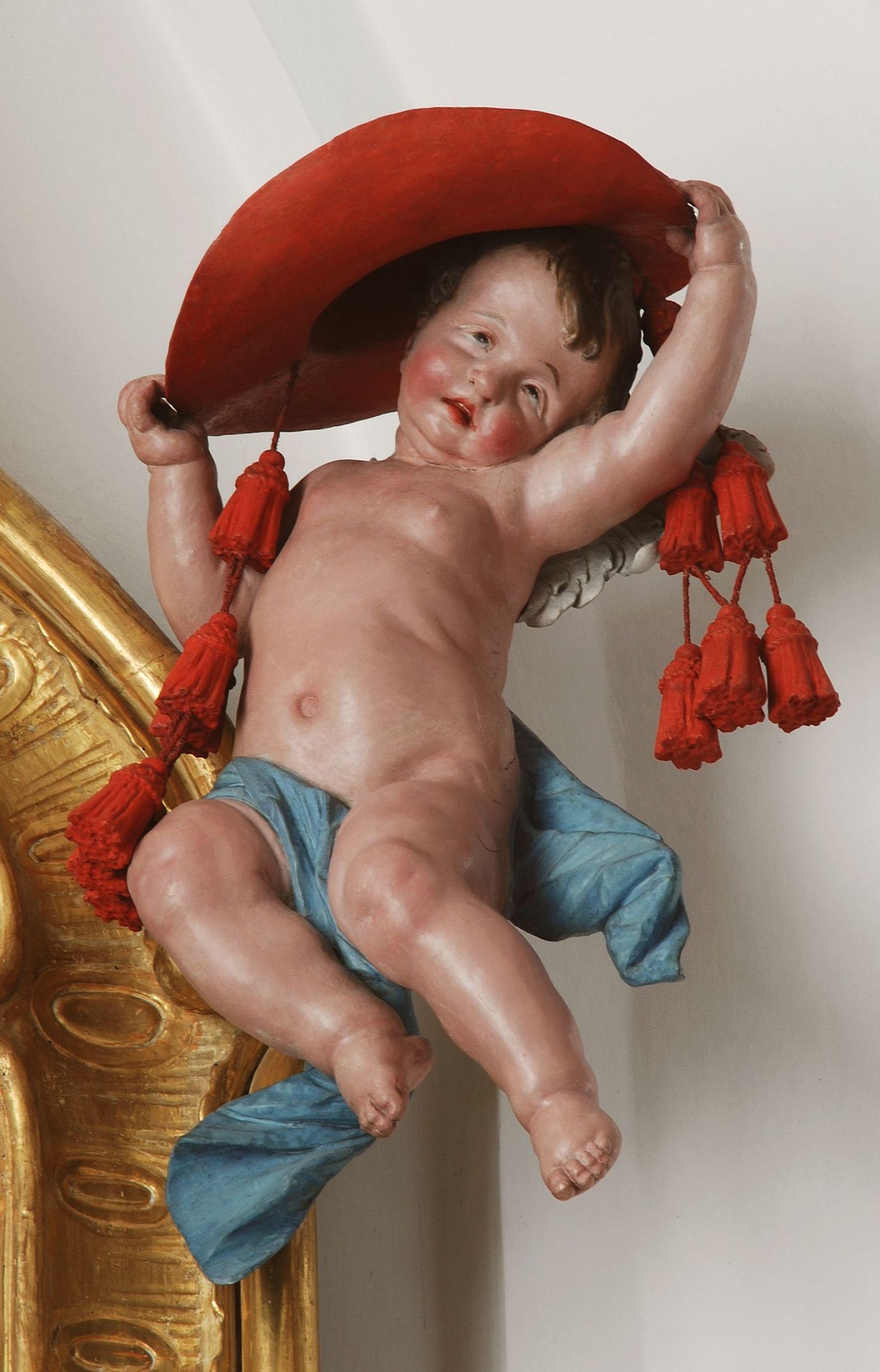 Das Foto zeigt ein Ignaz Günther-Werk mit Kardinalshut vom Leonhard-Altar in Rott.