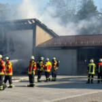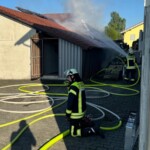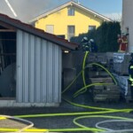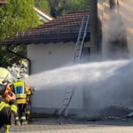 Update 18.20 Uhr: Das Feuer ist unter Kontrolle. Durch den raschen Einsatz der Feuerwehren konnte das Übergreifen der Flammen auf die anderen Gebäude, darunter ein Wohnhaus, verhindert werden. Polizeibericht folgt.