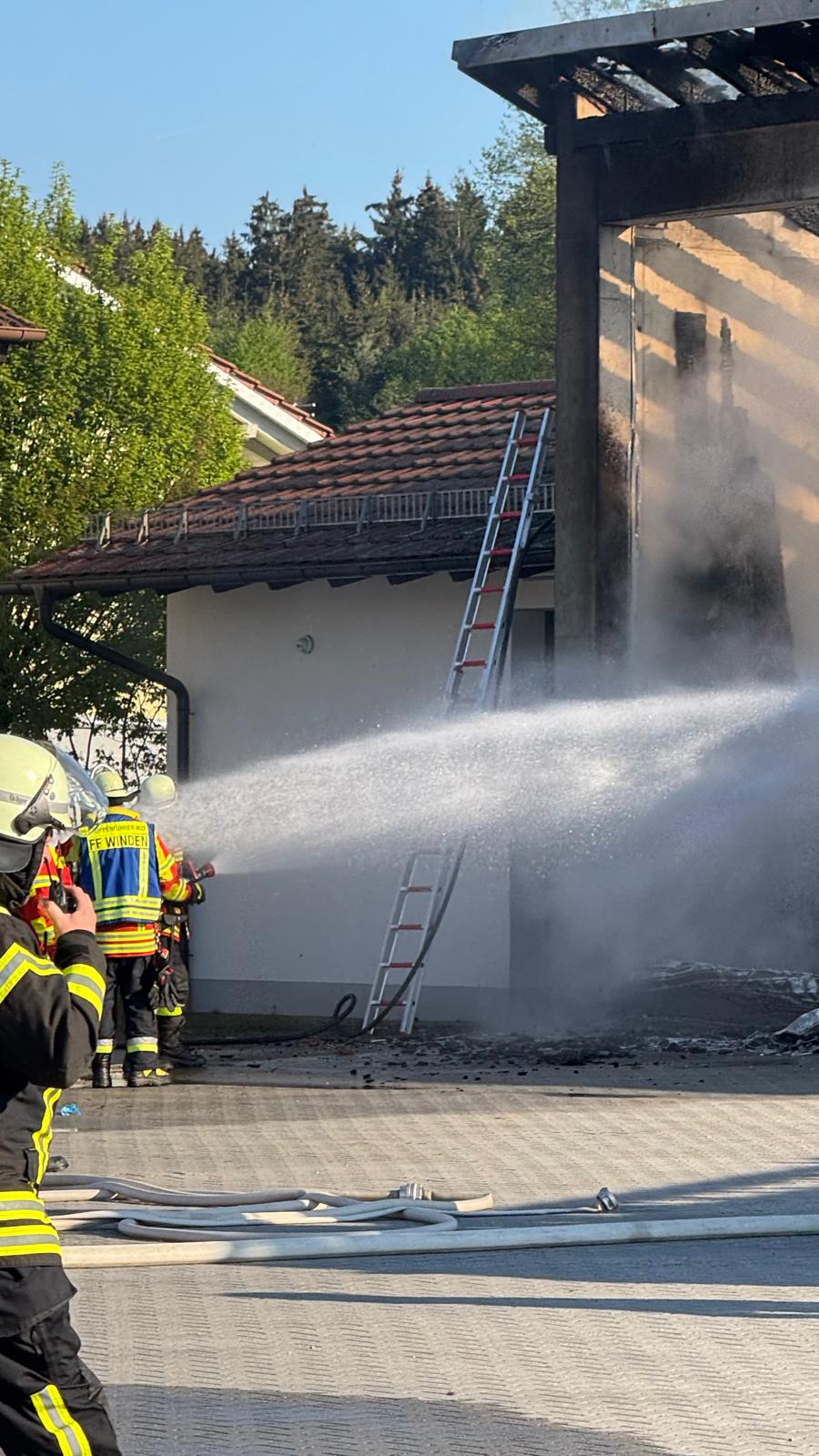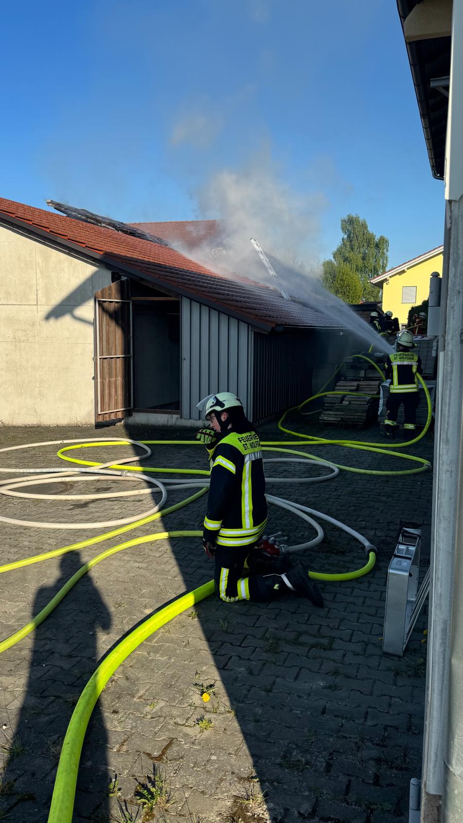 Update 18.20 Uhr: Das Feuer ist unter Kontrolle. Durch den raschen Einsatz der Feuerwehren konnte das Übergreifen der Flammen auf die anderen Gebäude, darunter ein Wohnhaus, verhindert werden. Polizeibericht folgt.