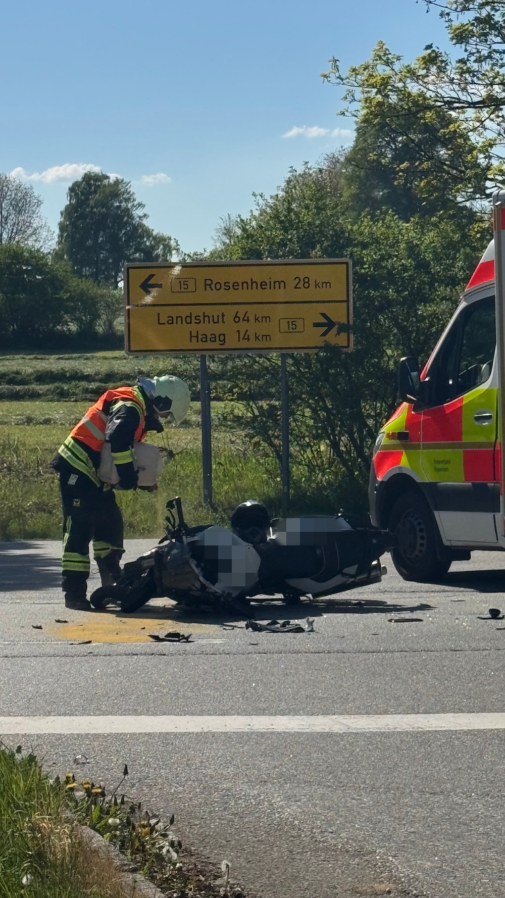 Gegen 15.45 Uhr befuhr gestern ein 28-jähriger Mann aus dem Landkreis Altötting mit seinem PKW die B15 in Fahrtrichtung Rosenheim. Zeitgleich war ein 42-Jähriger mit seinem Motorrad auf der B15 in entgegengesetzter Fahrtrichtung unterwegs. Der Pkw-Fahrer wollte nach links in Richtung Wasserburg abbiegen und übersah dabei den vorfahrtsberechtigten Kraftradfahrer. Beim Zusammenprall der Fahrzeuge stürzte der Kraftradfahrer auf die Straße und blieb verletzt liegen. Er musste schwerverletzt in ein Krankenhaus gebracht werden. Der Pkw-Fahrer blieb unverletzt.