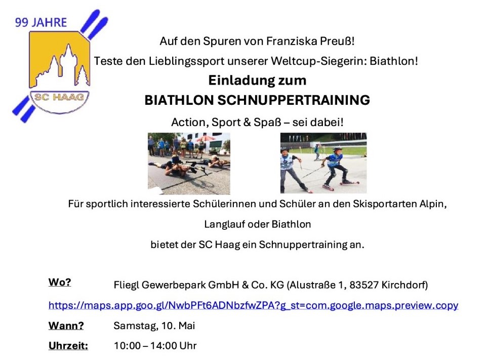 Neues entdecken, sich ausprobieren – zum Beispiel mal bei einem Biathlon-Schnuppertraining beim Ski-Club Haag auf den Spuren von Franzi Preuß: Das bietet der SC allen Schülern nächste Woche am Samstag, 10. Mai, von 10 bis 14 Uhr beim Fliegl-Gewerbepark in Kirchdorf bei Haag, Alustraße 1.