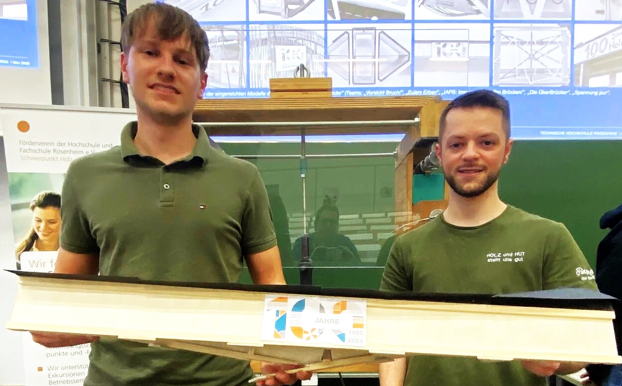 Bei der Prüfung war entscheidend, wie viel Traglast eine Brücke im Verhältnis zu ihrem Eigengewicht maximal aufweist, bevor sie bricht. Bei diesem Quotienten hatten die Holztechnik-Studenten Korbinian Müller und Florian Nießlbeck die Nase vorn. Mit ihrer Brücke „Geschmückt überbrückt“ ließen sie die Konkurrenz hinter sich.