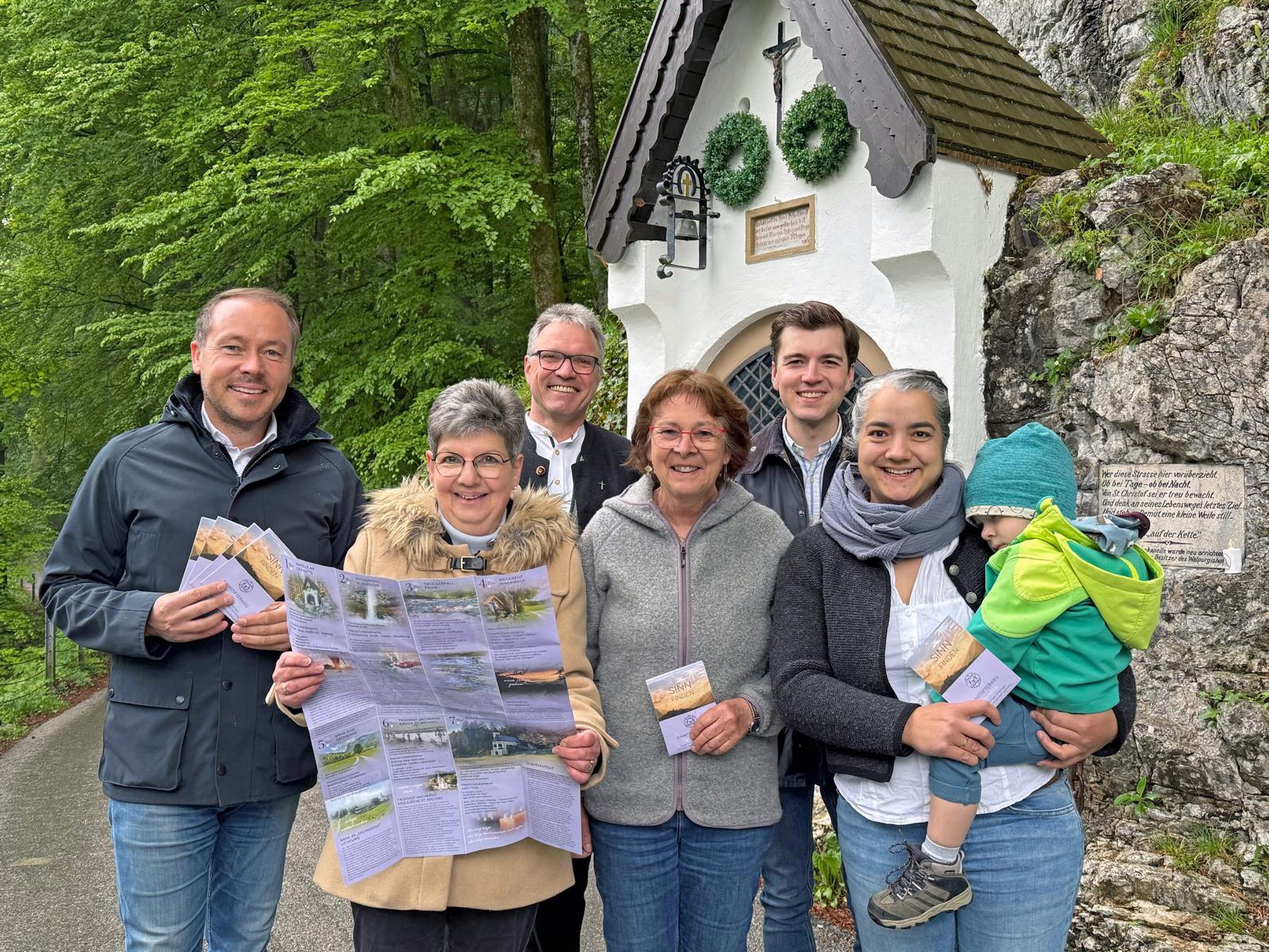 Mit dabei waren Pfarrer Paul Janßen (3. von links), Priesteramtskandidat Dr. Christian Elsen (5. von links), Monika Kleber (rechts) von der Pfarrgemeinde, Regina Maurer-Fuchs (2. von links) von der Tourist-Info Sachrang, Monika Krempl (4. von links) und Aschaus Tourismuschef Herbert Reiter (links) – alle gemeinsam Ideengeber und Umsetzer des Projekts.