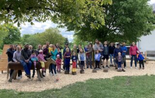 Eltern und Kinder der evangelischen Kita „Löwenzahn“ in Pfaffing mit gemeinsamer Gartenaktion