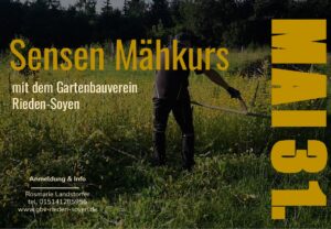 Am kommenden Samstag, 24. Mai, organisiert der Gartenbauverein Rieden-Soyen einen Sensen-Mähkurs in Soyen. Es gibt noch freie Plätze, Mitglieder zahlen zehn Euro, Nichtmitglieder 15 Euro.