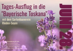 Am Samstag, 28. Juni, unternimmt der Gartenbauverein Rieden-Soyen eine Tagesfahrt in die „Bayerische Toskana“ im Raum Dorfen mit Besichtigung einer Gärtnerei und eines Lavendelbauern. Es gibt noch freie Plätze.