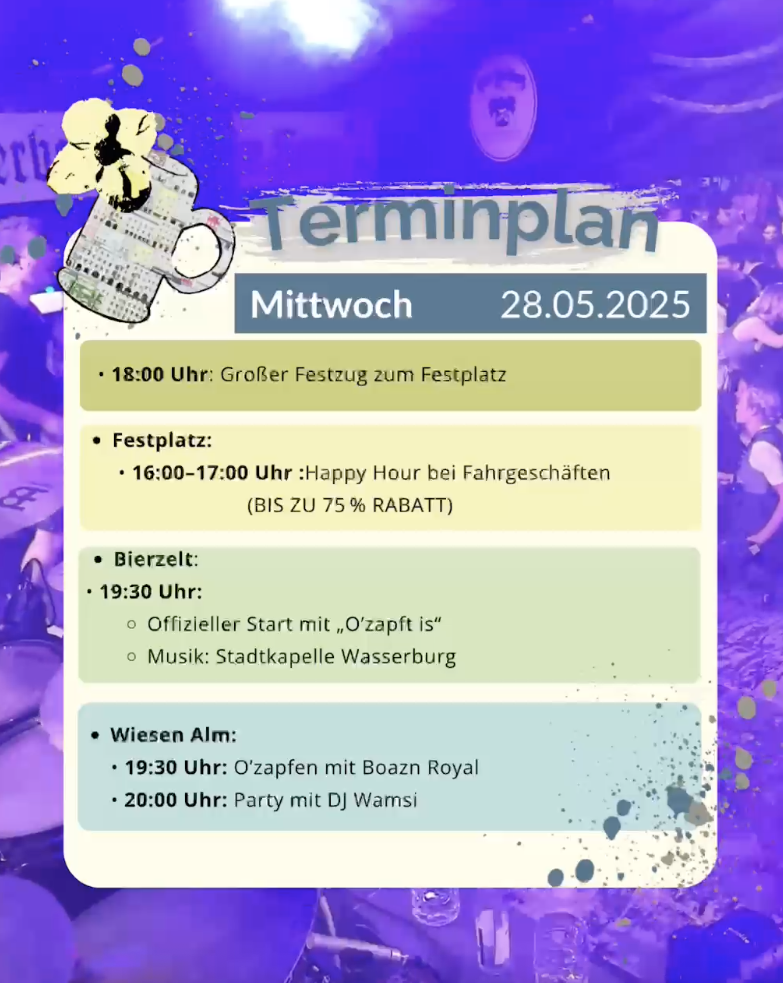 Heute auf dem Frühlingsfest: Tag 1 Ab 16 Uhr Happy Hour auf dem Festplatz - Anzapfen gegen 19.30 Uhr Unsere Übersicht zum Festprogramm – Tag 1 heute auf dem Frühlingsfest: Teilen Sie diesen Beitrag!teilen teilen merken teilen teilen teilen Schaufenster Von Christian Huber|2025-05-27T18:31:15+02:00Mi. 28.5.2025 - 10:00|Kategorien: Schlagzeilen|Tags: WIESN 2025|0 Kommentare Hinterlassen Sie einen Kommentar Antworten abbrechenKommentar Mit der Nutzung dieses Formulars erklären Sie sich mit der Speicherung und Verarbeitung Ihrer Daten durch diese Website einverstanden. Weitere Informationen erfahren Sie in der Datenschutzerklärung. Bitte lesen Sie hier auch unseren Leitfaden für die Veröffentlichung von Kommentaren. * Δ