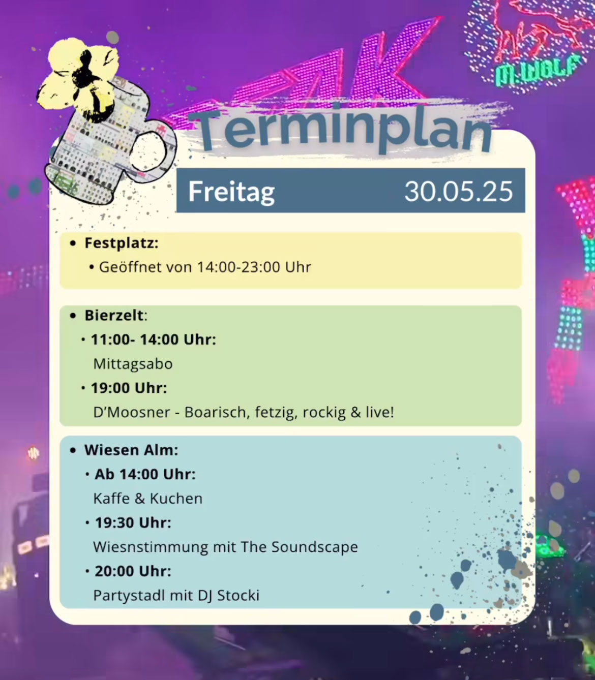 Heute auf dem Frühlingsfest: Tag 3 „D'Moosner" und „The Soundscape" sorgen heute Abend im Bierzelt und Wiesenalm für beste Stimmung Unsere Übersicht zum Festprogramm – Tag 3 heute auf dem Frühlingsfest: Teilen Sie diesen Beitrag!teilen teilen merken teilen teilen teilen Schaufenster Von Robert Berer|2025-05-30T11:27:59+02:00Fr. 30.5.2025 - 11:27|Kategorien: Schlagzeilen|Tags: WIESN 2025|0 Kommentare Hinterlassen Sie einen Kommentar Antworten abbrechenKommentar Mit der Nutzung dieses Formulars erklären Sie sich mit der Speicherung und Verarbeitung Ihrer Daten durch diese Website einverstanden. Weitere Informationen erfahren Sie in der Datenschutzerklärung. Bitte lesen Sie hier auch unseren Leitfaden für die Veröffentlichung von Kommentaren. * Δ