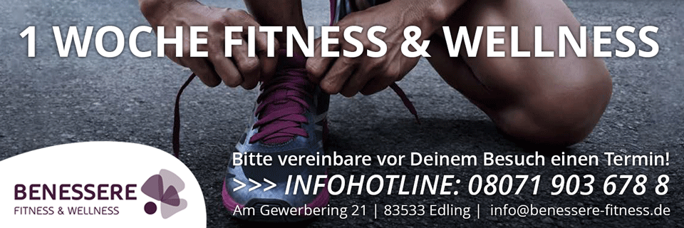 Mit einer Terminvereinbarung unter Telefon 08071 / 90 36 788 oder per E-Mail an info@benessere-fitness.de steht der kostenlosen Testwoche nichts mehr im Wege.