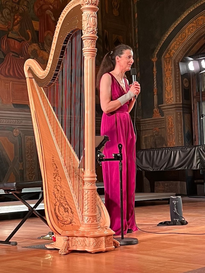 Mit dem ukrainischen Volkslied „Dumka“, was so viel heißt wie „Gedanke“ oder „Betrachtung“ von Wassil Barvinsky machte Silke Aichhorn auch auf die aktuellen politische Krisen in unserer Zeit aufmerksam und leitete dann zu Bedřich Smetanas „Die Moldau“ über jener Programmmusik, die der tschechische Komponist über den Fluss schrieb, dessen zwei Quellflüsse im Böhmerwald und im Bayerischen Wald entspringen und der hinter Prag in die Elbe mündet. Die Energie der Quelle und der weitere mal ruhige, mal fast stürmische Verlauf des Flusses wurde durch das Harfenspiel von Silke Aichhorn sehr eindrücklich in den Rathaussaal getragen, aber auch eine Jagd und eine Bauernhochzeit werden musikalisch den Zuhörern nahegebracht.