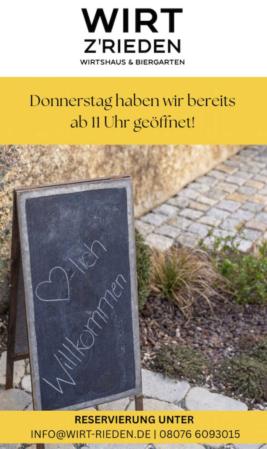 Reservierungen über die Homepage www.wirt-rieden.de oder mail an info@wirt-rieden.de, Telefon 08076 / 60 93 0 15.