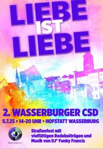 Am Samstag, 5. Juli, findet in Wasserburg bereits zum zweiten Mal der Christopher Street Day statt – ein buntes Straßenfest, das unter dem Motto „Liebe ist Liebe“ steht. Von 14 bis 20 Uhr wird die Hofstatt zu einem bunten Fest der Vielfalt und der Liebe. Der Christopher Street Day (CSD) ist ein Festtag, Gedenktag und Demonstrationstag – gefeiert und demonstriert wird für die Rechte queerer Menschen sowie gegen rechtliche und soziale Diskriminierung, Ausgrenzung und Verfolgung.