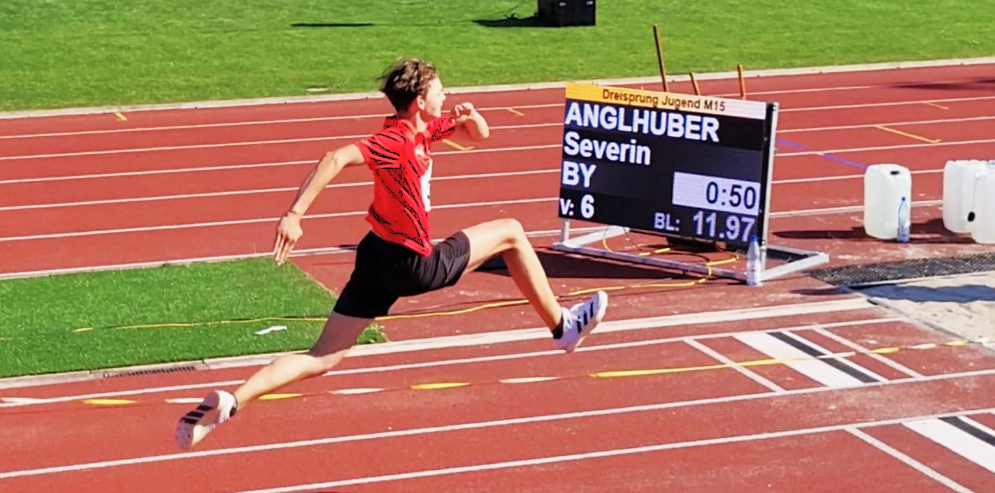 Große Freude bei den Wasserburger Leichtathleten: Severin Anglhuber ist Süddeutscher Vizemeister! Er überraschte mit dem zweiten Platz im Dreisprung der M15 (Foto). In einem spannenden Wettkampf steigerte er in seinem letzten Versuch seine Bestleistung um starke 30 Zentimeter auf 12,27m. Mit dieser Weite lag er nur noch drei Zentimeter hinter dem Sieger Leonard Thomas von der SV Seckenheim. Damit hat er gute Chancen auf vordere Platzierung bei den anstehenden Deutschen M15-Meisterschaften in Ulm in zwei Wochen.
