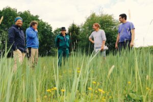 Unser Bild zeigt von links Stefan Deuschl (Leiter Inntal-Werkstätter), Manfred Gütter, Peter Steinmüller (Abteilungsleiter Attler Hof), Jonas Garschhammer (Biodiversitätsberater) und Andreas Berger (Landschaftspfleger) beim Ortstermin im Mai.