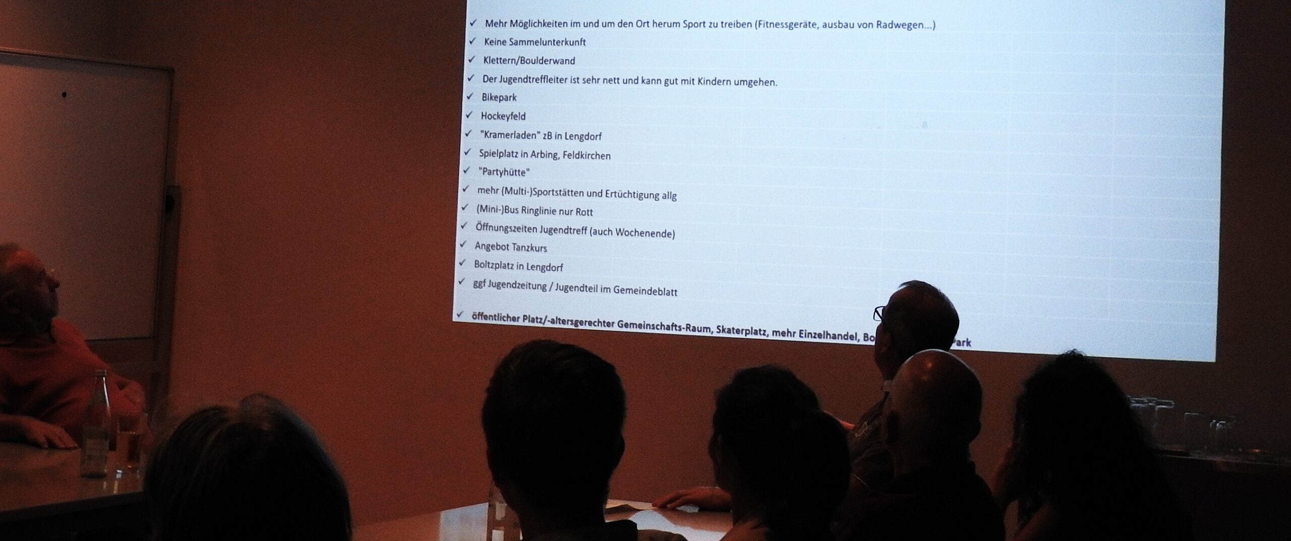 Und hier mal ein Blick auf die Wünsche der Rotter Jugend aus der Stoffsammlung der Jugendversammlung, bei der es Themen-Tische gab. Allen voran wurde hier als Wunsch ein öffentlicher Platz genannt für offenen Sport und Treffen. Besonders oft sei der Hockey-Sport genannt worden, so Wendrock. Und auch der Wunsch nach einem Beachvolleyball-Platz kam in der Sitzung gestern Abend in Rott zur Sprache.