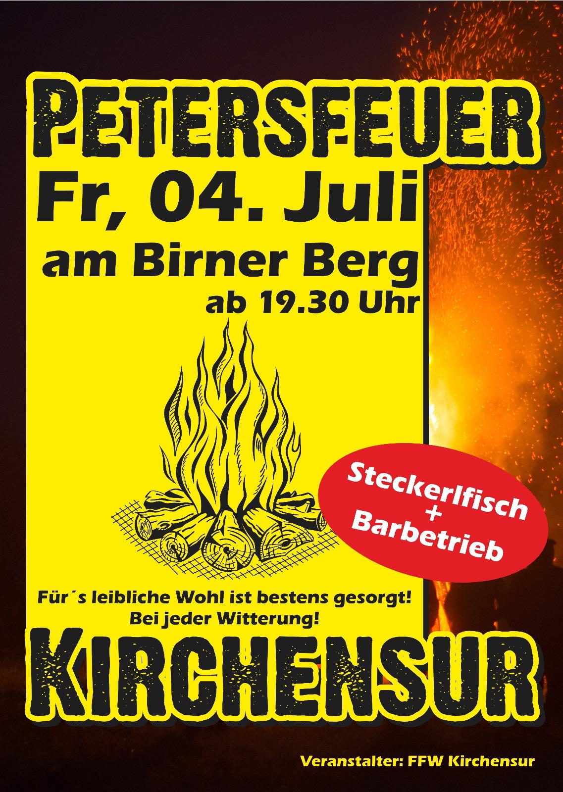 Die Feuerwehr Kirchensur lädt herzlich zum Petersfeuer am kommenden Freitag, 4. Juli, am Birner Berg ein. Ab 19.30 Uhr dürfen sich die Besucher auf Steckerlfisch und weitere Köstlichkeiten freuen. Zu späterer Stunde wird dann die Bar eröffnet.