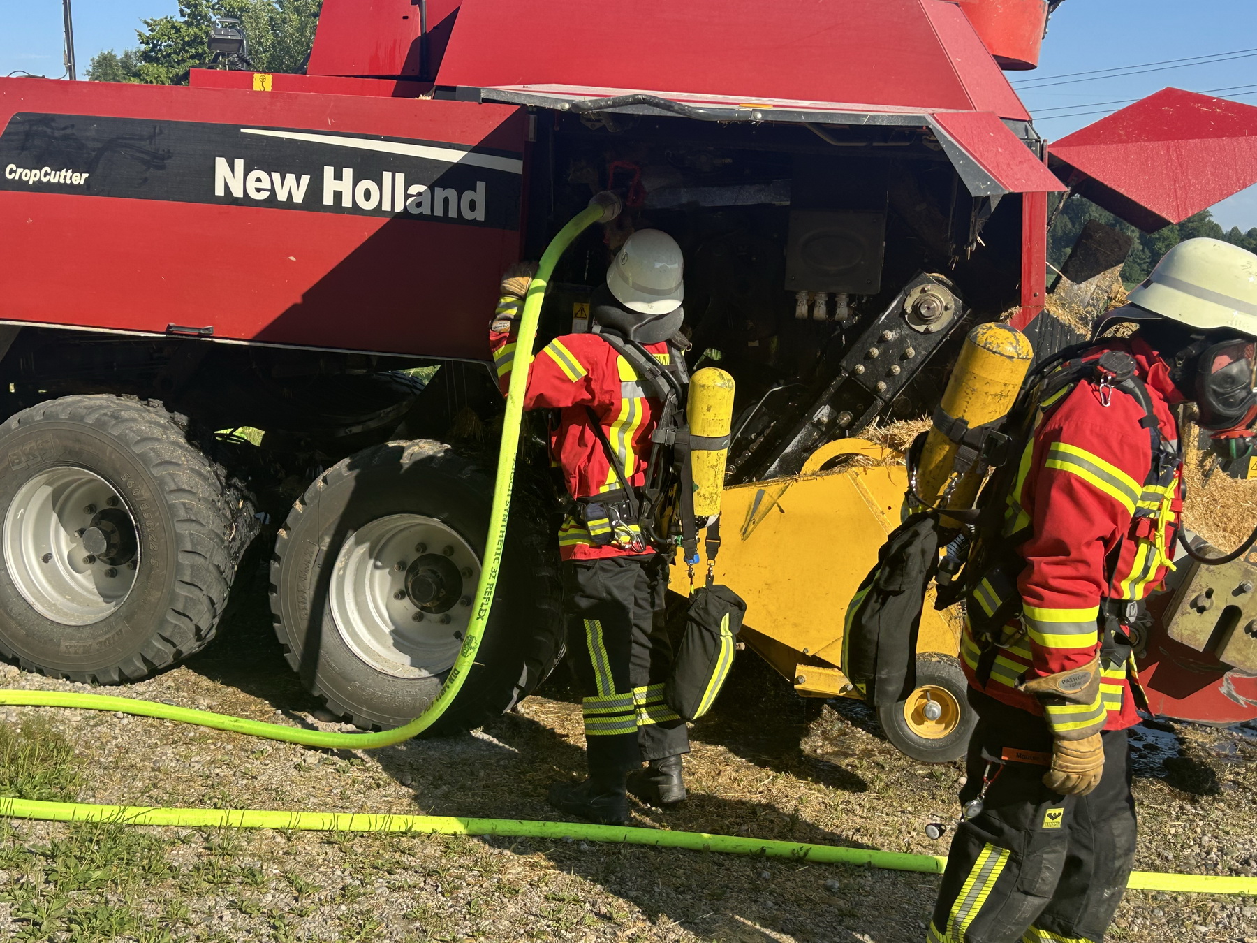 Alarm für die Feuerwehr Bachmehring: Gegen 17.45 Uhr rückten die Floriansjünger am späten Mittwochnachmittag in Richtung des Weilers Straß aus. Dort stand eine Heuballen-Presse nach einem vermutlich technischen Defekt in Flammen. Auch Polizei und Rettungsdienst sowie Kreisbrandinspektor Stephan Hangl und Kreisbrandmeister Michael Mayer waren im Einsatz. Der Brand war zum Glück rasch unter Kontrolle. Polizeibericht folgt. Fotos: RB