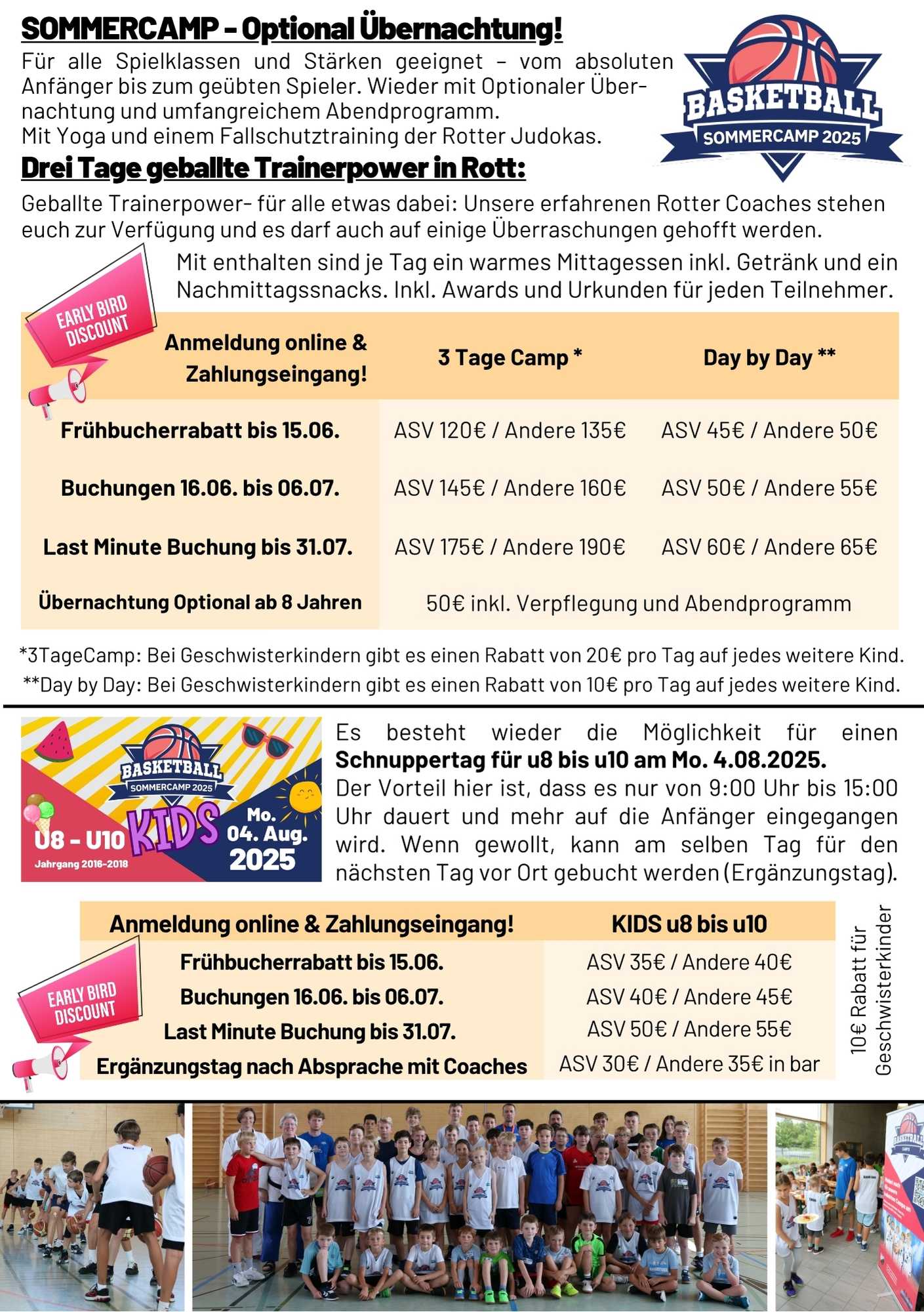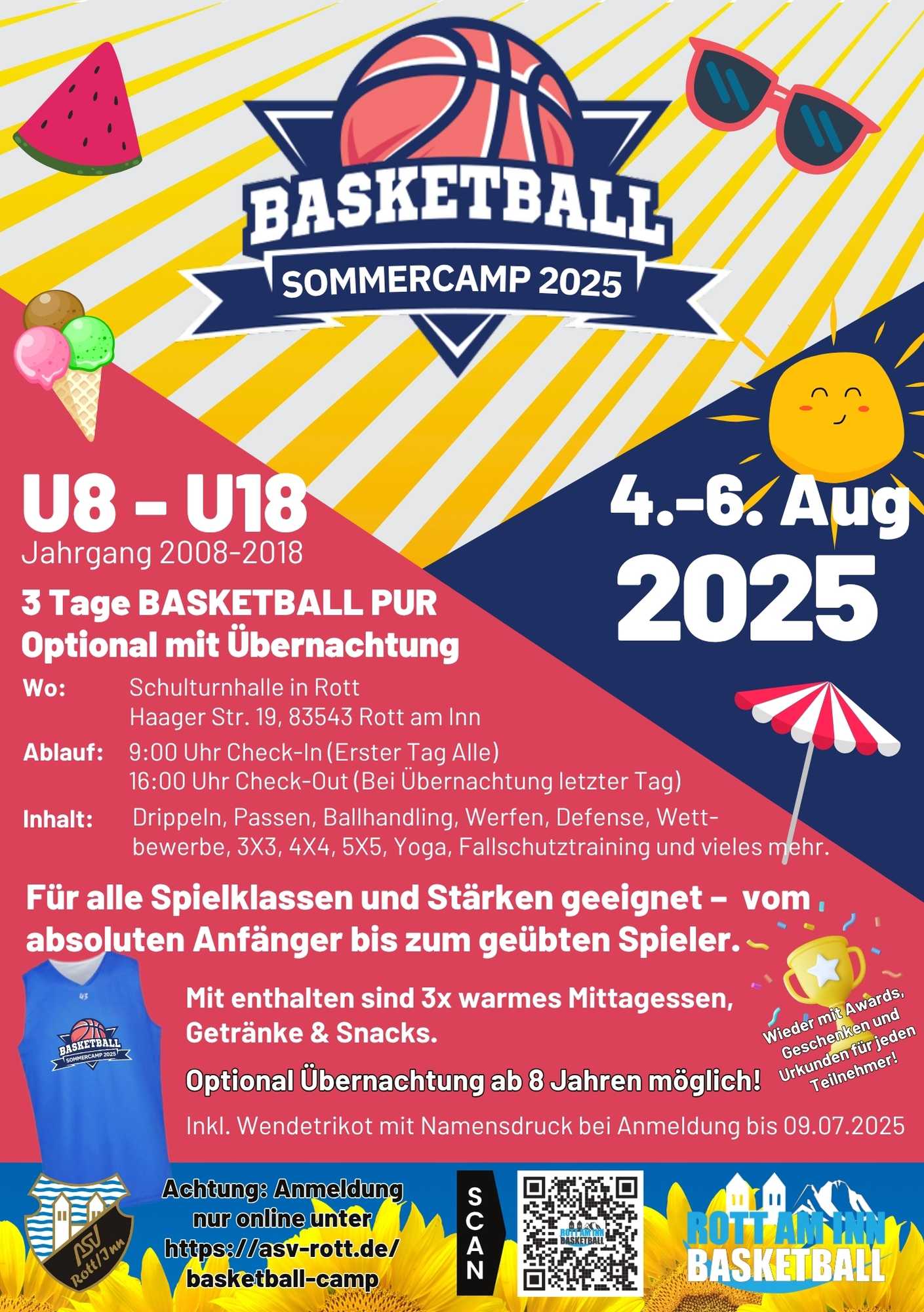 In den Sommerferien bietet der ASV Rott Basketball vom 4. bis 6. August ein dreitägiges Sommercamp für die U8 bis U18 – also Jahrgang 2008 bis 2018 – in der Rotter Schulturnhalle an. Ablauf: Jeweils 9 Uhr Check-In und um 16 Uhr Check-Out.