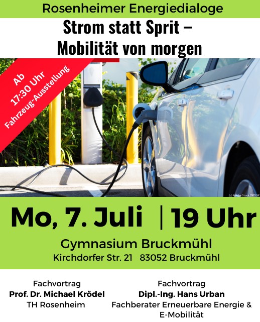 Unter dem Titel „Strom statt Sprit – Mobilität von morgen“ laden die Rosenheimer Energiedialoge am kommenden Montag, 7. Juli, zu einer Informationsveranstaltung in die Aula des Gymnasiums in Bruckmühl ein. Die Vorträge beginnen um 19 Uhr. Bereits ab 17.30 Uhr erwartet die Besucher eine Begleitausstellung mit Elektrofahrzeugen – präsentiert von regionalen Unternehmen und engagierten Privatpersonen vor dem Schulgebäude.