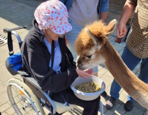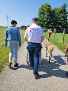 Unweit vom Wohnort wurden die Chiemgau-Alpakas besucht. Hubert Held vom Alpakahof begrüßte alle herzlich und erzählte viel Wissenswertes über die Tiere, die gefüttert und gestreichelt werden durften. Inge genoss die Nähe zu den Alpakas und ihr sehr weiches Fell. Bevor es zu einer kleinen Wanderung ging, stärkte sich die Gruppe bei einer kleinen Kaffeepause. Alpaka Marcelo wurde als Begleiter für Inge auserkoren. Dieser Alpakahengst ist es gewohnt, mit Rollstuhlfahrern zu gehen und zauberte Inge ein Lächeln ins Gesicht.