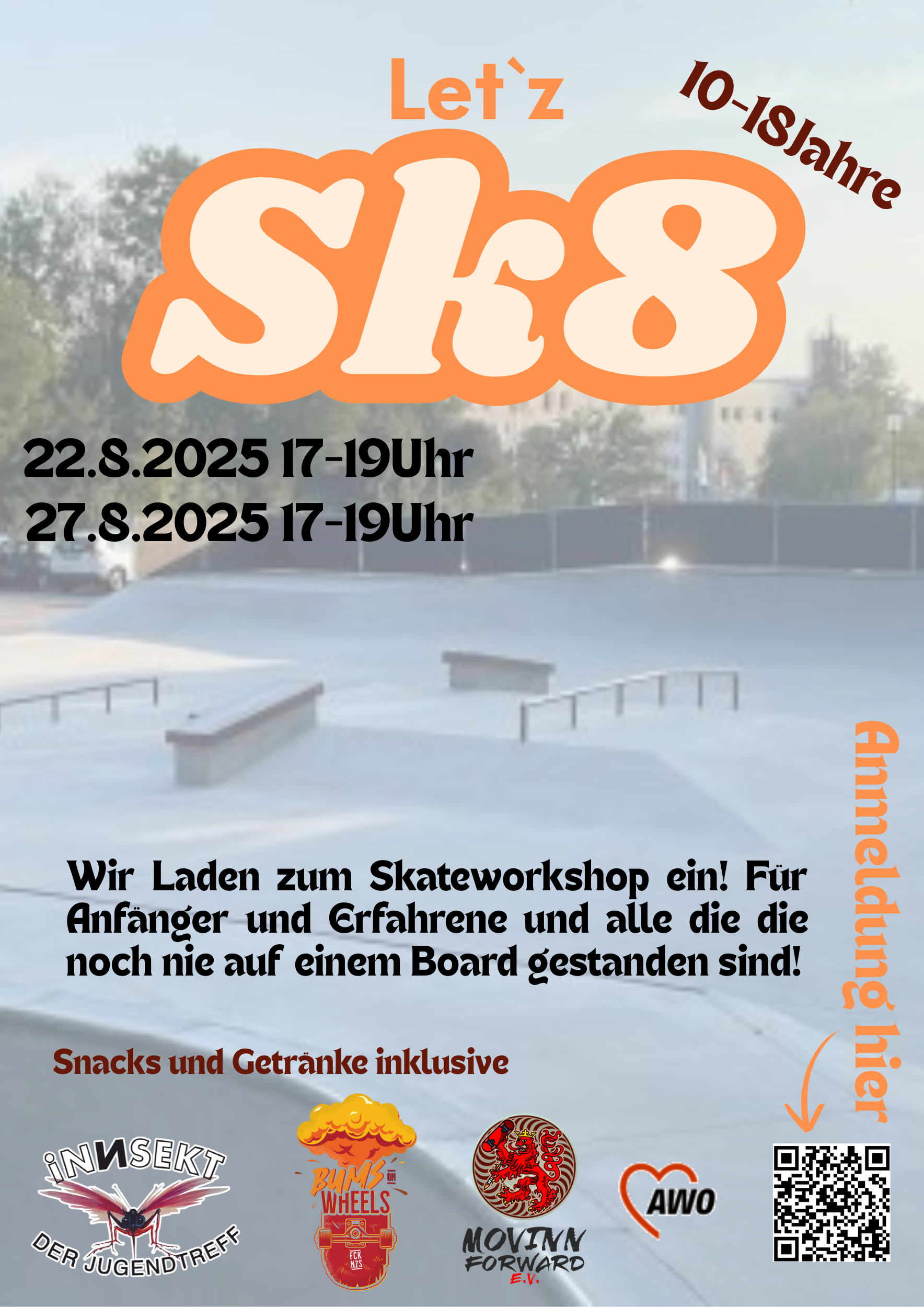 Wer schon mal auf einem Skateboard stand und neue Tricks lernen möchte, ist hier willkommen – genauso wie all die, die es noch nicht versucht haben, aber es mal probieren möchten. Skateboards und Schutzausrüstung sind vorhanden …