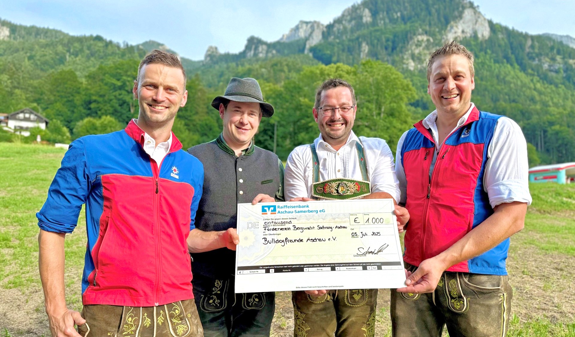 Bereitschaftsleiter Thomas Riepertinger (links) von der Bergwacht Sachrang-Aschau freut sich über die großzügige Spende, die ihm von Alois Schmid junior (2. von links) und Sebastian Aringer (2. von rechts) von den Bulldogfreunden Aschau überreicht wurde.