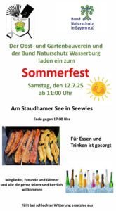 Am kommenden Samstag, 12. Juli, veranstaltet der Obst- und Gartenbauverein Reitmehring zusammen mit dem Bund Naturschutz ein gemeinsames Sommerfest. Es findet im öffentlichen Badebereich in Seewies am Staudhamer See statt und beginnt um 11 Uhr.