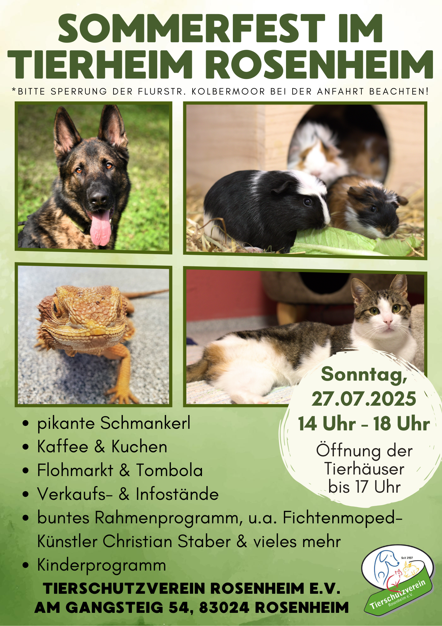 Am Sonntag, 27. Juli, findet von 14 bis 18 Uhr ein großes Sommerfest mit einem „Tag der offenen Tür“ im Rosenheimer Tierheim am Gangsteig 54 statt. Die Tierhäuser sind an diesem Tag von 14 bis 17 Uhr geöffnet und man kann die Schützlinge des Tierheims besuchen. Der Tierschutzverein Rosenheim e.V. freut sich auf viele Besucher.