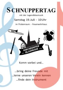 Wer schon immer mal ein Blasinstrument ausprobieren wollte oder einfach neugierig ist, wie es in einem Musikverein zugeht, sollte am kommenden Samstag, 19. Juli, um 10 Uhr zum Schnuppertag der Kirchdorfer Blasmusik in den Probenraum im Feuerwehrhaus Kirchdorf kommen.