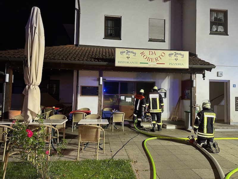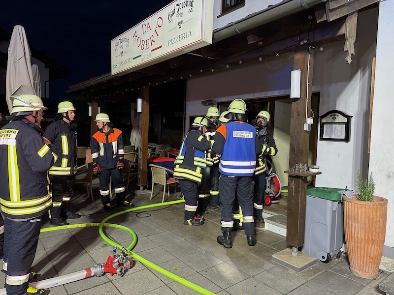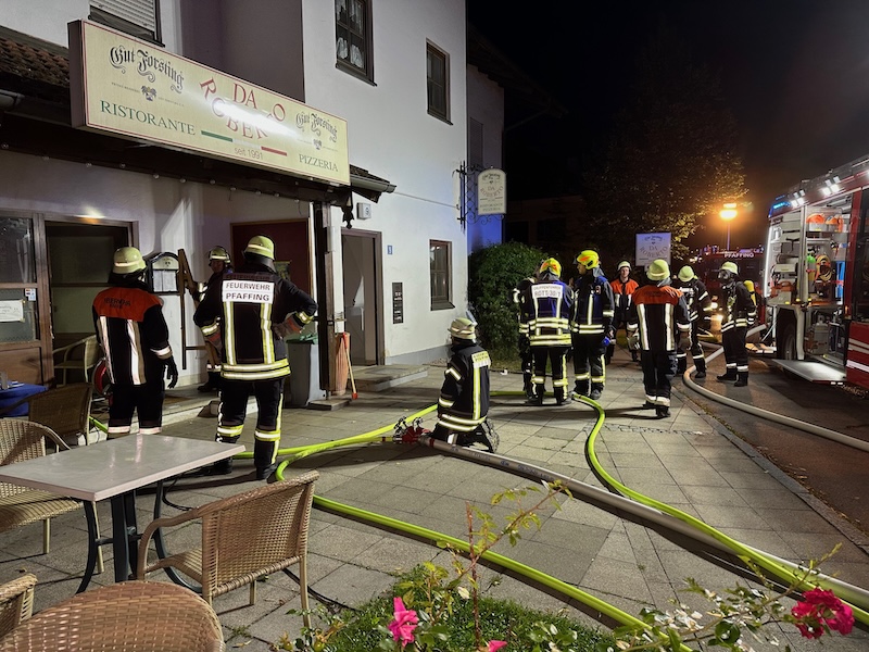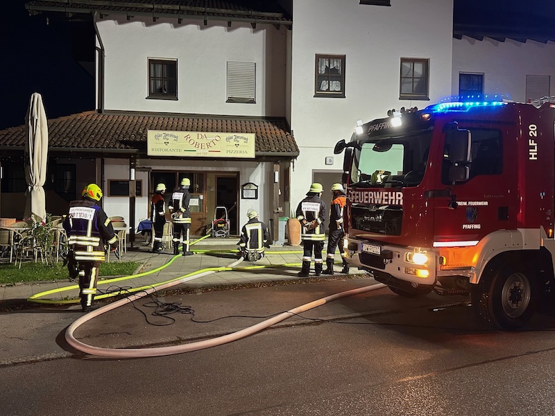 Alarm für die Feuerwehren Pfaffing, Rott und Edling am frühen Sonntagmorgen: Die Floriansjünger rückten heute gegen 4.30 Uhr in die Ortsmitte von Pfaffing aus. In der Küche einer Pizzeria war ein Brand ausgebrochen. Das Feuer war zum Glück rasch unter Kontrolle. Verletzt wurde niemand, es entstand aber erheblicher Sachschaden. Polizeibericht folgt. Fotos: Georg Barth