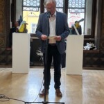 Abschließend betonte er, dass der AK68 mit seiner Vorsitzenden, Katrin Meindl, und ihrem dahinterstehenden Team einen stets unermüdlichen Einsatz gezeigt hätten, um die Mammutaufgabe dieser Ausstellungsvorbereitung zu gewährleisten. Und so übergab Bürgermeister Kölbl, der vom Zweitem. Bürgermeister Werner Gartner und der Dritten Bürgermeisterin und Kulturreferentin Edith Stürmlinger begleitet und unterstützt wurde, dem AK68 symbolisch die Schlüssel zum Rathaus, damit die Kunst in den Augusttagen das Regiment im Rathaus übernehmen könne.