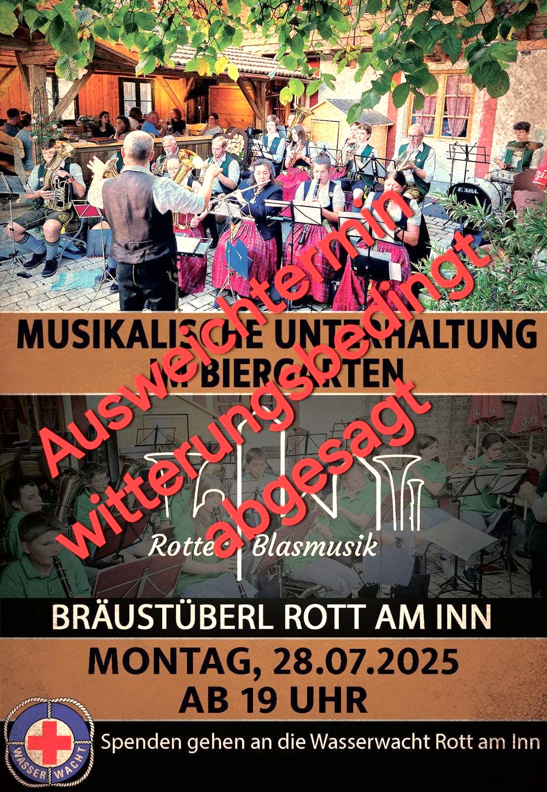 Nix wird’s mit dem Ausweichtermin mit der Hoffnung auf besseres Wetter: Gemeinsam Musik machen für einen guten Zweck – das wollte die Rotter Blasmusik mit ihrer offenen Benefizprobe zugunsten der Wasserwacht am heutigen Montag-Abend im Biergarten des Bräustüberls im Dorfzentrum.