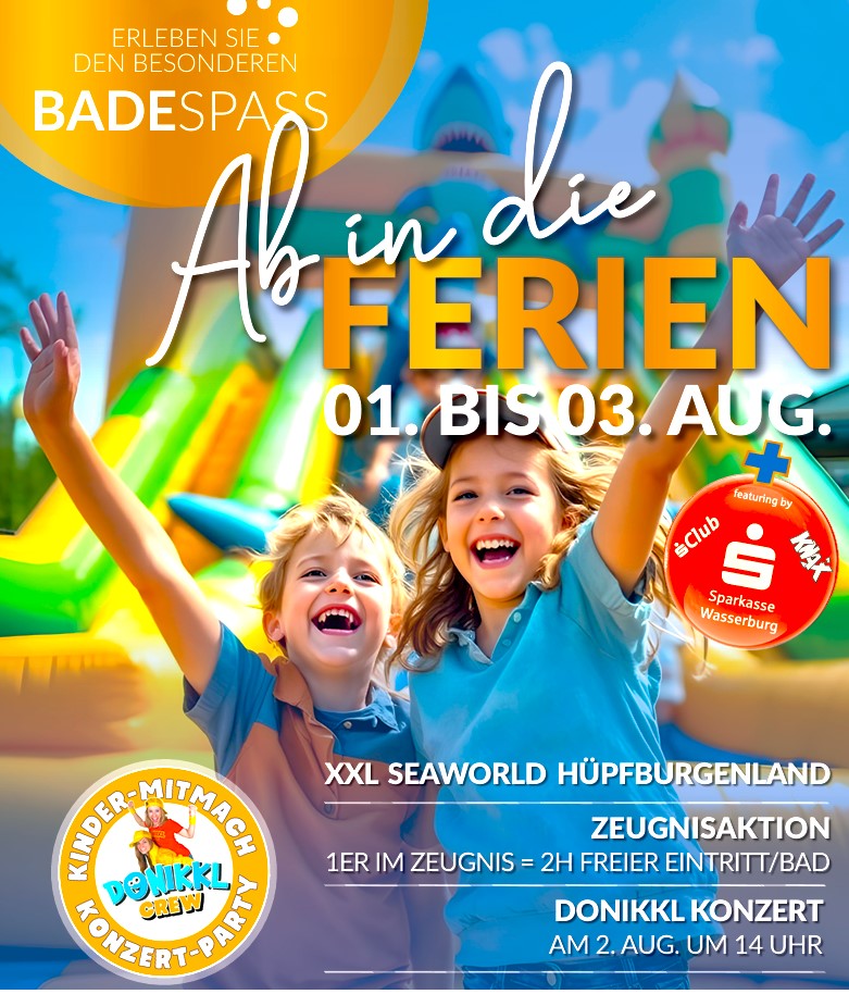 Die „XXL Seaworld Hüpfburgenland“ wird in der Badria-Halle zum Hüpfen aufgebaut – so kann unbegrenzt vor oder nach dem Baden im Trockenen gehüpft werden. Der Eintritt in die Badria-Halle ist kostenlos.