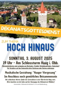 Unter dem Motto „Hoch hinaus“ steht der Dekanatsgottesdienst, der am kommenden Sonntag, 3. August, um 19 Uhr, im Haager Schlosshof stattfinden wird.