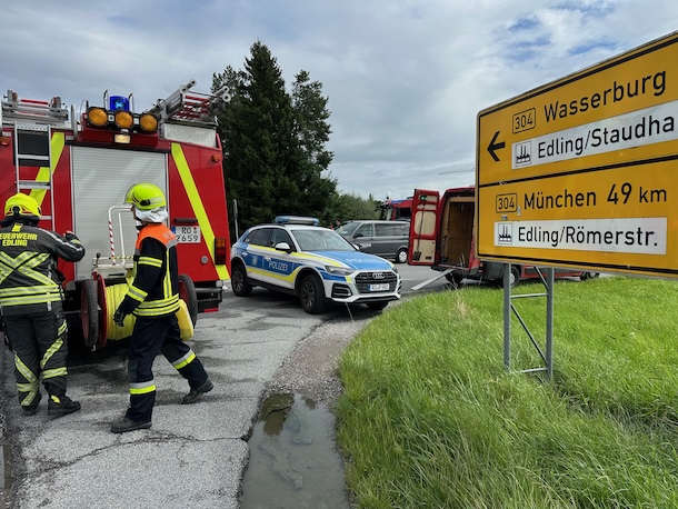 Einsatz für die Edlinger Feuerwehr am Sonntagnachmittag: Gegen 15.50 Uhr rückten die Floriansjünger auf die B304 an der Abzweigung Richtung Albaching aus. Dort war ein Motorradfahrer gestürzt, blieb dabei aber nahezu unverletzt. Allerdings verlor seine Maschine nach dem Sturz Betriebsstoffe. Die Floriansjünger reinigten die Fahrbahn. Die Feuerwehr Albaching war zufällig bei einer Ausfahrt im Rahmen des Ferienprogramms als erste an der Unfallstelle vorbeigekommen. Fotos: Georg Barth