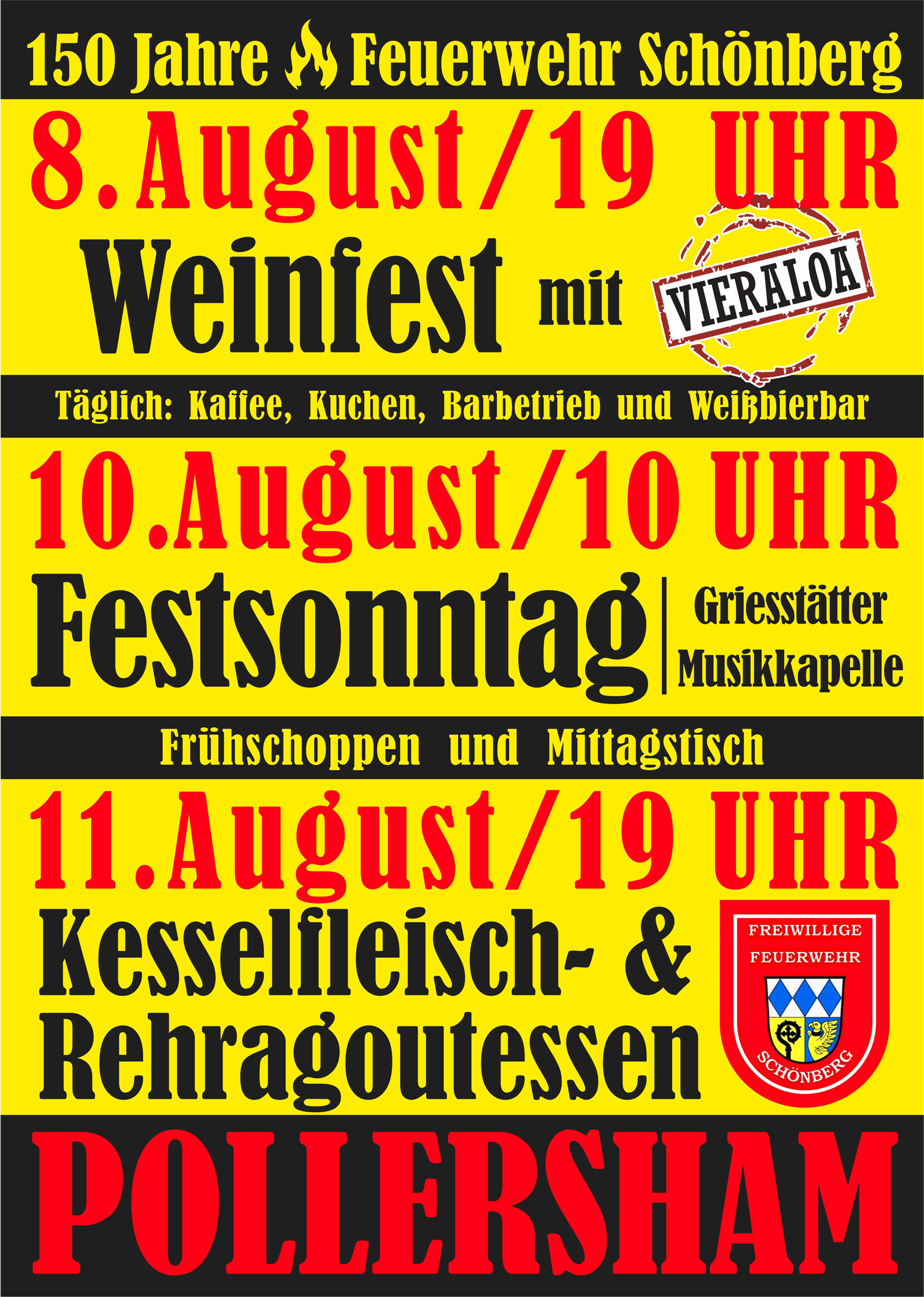 Ein besonderes Jubiläum steht bevor: Die Feuerwehr Schönberg feiert 150-jähriges Bestehen von Freitag, 8. August, bis Montag, 11. August, Die Besucherinnen und Besucher erwartet in der Festhalle in Pollersham im Gemeindegebiet Eiselfing ein stimmungsvolles Festwochenende für die ganze Familie.