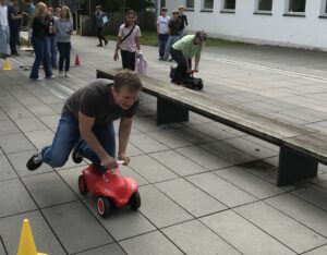 Unser Bild oben zeigt die Lehrkräfte Stefan Hilbert und Bärbel Conzelmann beim Bobby-Car-Rennen.