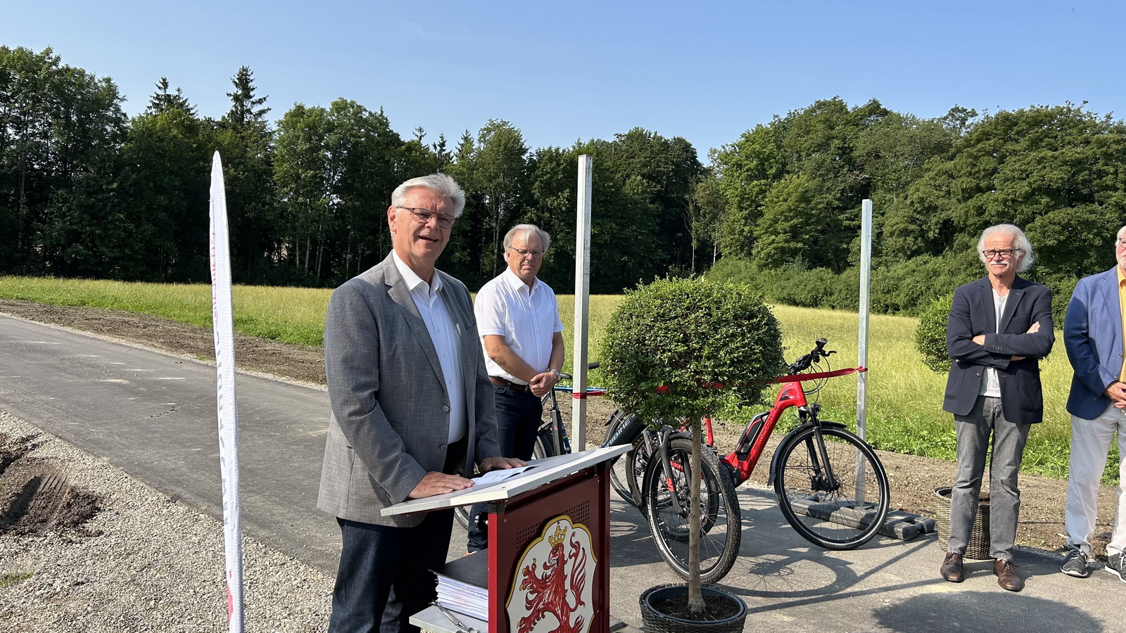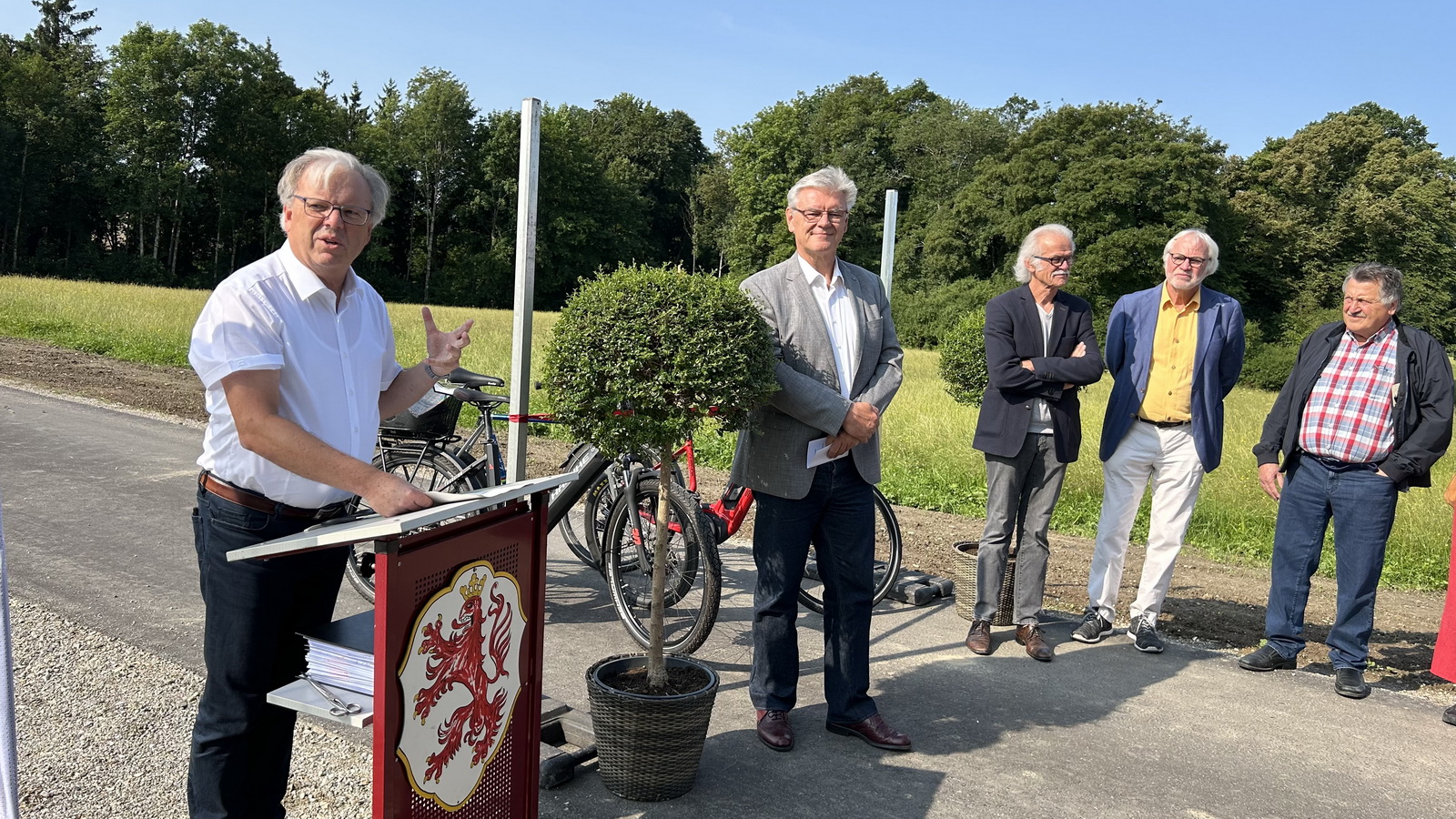 Kölbl erinnerte humorvoll an die lange Vorgeschichte des Projekts und begann seine Ansprache mit den Worten: „Es war einmal ein fürchterlicher Schotterweg zwischen Gern und Gabersee.“ Der neue asphaltierte Weg sei eine enorme Verbesserung, sowohl für den Alltagsradverkehr als auch für den Fernradverkehr – verlaufen dort doch bedeutende Routen wie der Inntalradweg und der Mozart-Radweg. Besonders hob er das Engagement des ehemaligen Stadtbaumeisters Manfred Förtsch hervor, der sich jahrelang für die Sanierung des Weges eingesetzt hatte. Kölbl entschuldigt dessen Abwesenheit, Förtsch weilte im Urlaub. Ausdrücklich würdigte er dessen Beitrag zum Zustandekommen der Vereinbarung mit dem Bezirk Oberbayern und stellte das ausführlich dar.