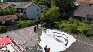 Nach einer stärkenden Mittagspause ging es mit voller Energie weiter. Ein Saugleitungsbau auf Zeit forderte Schnelligkeit und Präzision. Der Höhepunkt am Nachmittag war eine realitätsnahe Einsatzübung, bei der ein Schulbrand simuliert wurde. Die jungen Kameraden übten den Löschaufbau und bekamen die Möglichkeit, erstmals mit Übungsschaum zu arbeiten, um dessen Einsatzweise kennenzulernen.