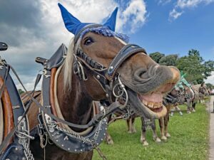 Das endlich sommerlich-warme Wetter lockt derzeit alle Generationen hinaus zu Dorffesten, Märkten und geselligen Veranstaltungen. Unser Schnappschuss zeigt ein sauber herausgeputztes Pferd mit hochgezogenen Lefzen und weit sichtbarem Grinsen, als wollte es sagen: „Na, wird ja auch Zeit, dass die Festlzeit jetzt im Gange ist.“