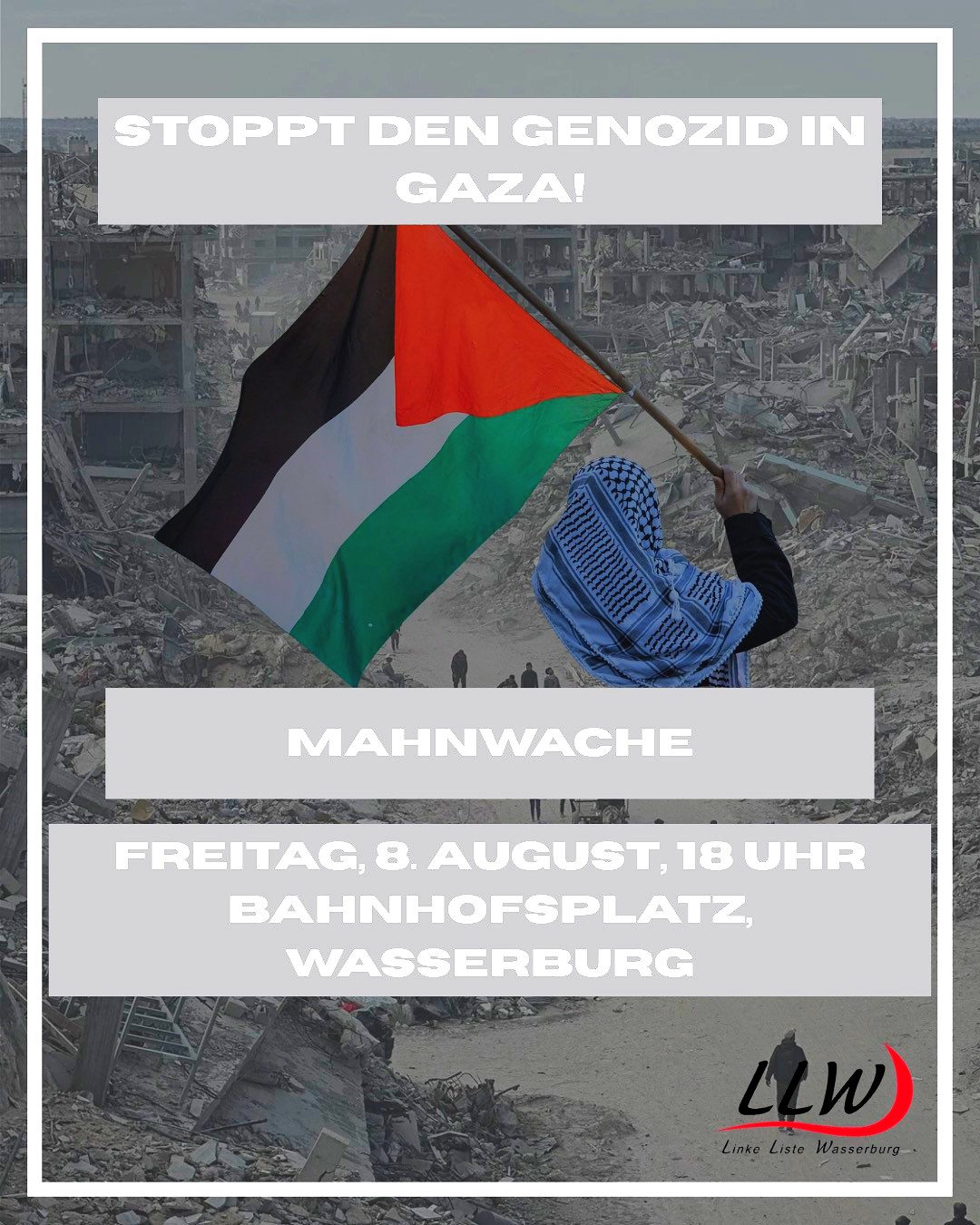 Seit Beginn der bewaffneten Auseinandersetzung mit dem 7. Oktober 2023 seien in Gaza mehr als 60.000 Menschen getötet und über 150.000 Menschen verletzt worden. Das Ziel Israels sei nicht die Befreiung der Geiseln, sondern die gesamte Zerstörung des Gazastreifens und die Vertreibung der Palästinenser aus dem Gazastreifen, so die Linke Liste Wasserburg (LLW) um Sophia Jokisch.