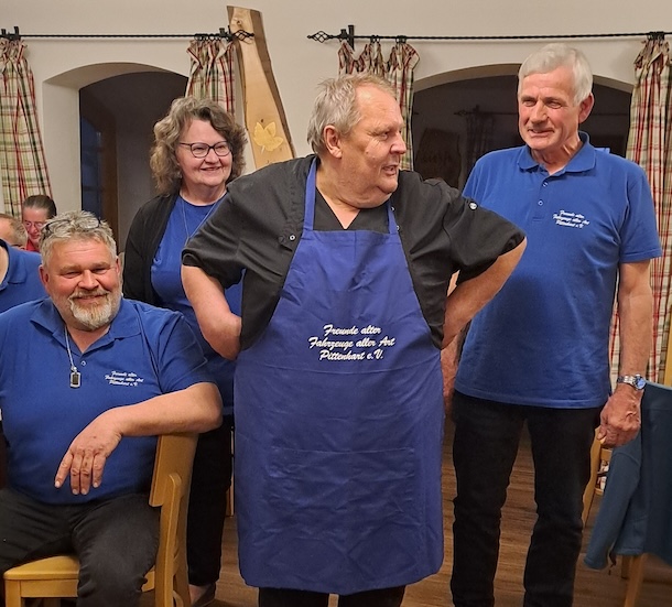 Die Freunde alter Fahrzeuge aller Art haben bei ihrem „Festwirt“ um die Übernahme der kompletten Bewirtung für das nächste Oldtimertreffen in Aindorf angefragt und ihm als kleine „Bestechung“ eine maßgeschneiderte Schürze mit dem Vereinslogo mitgebracht.