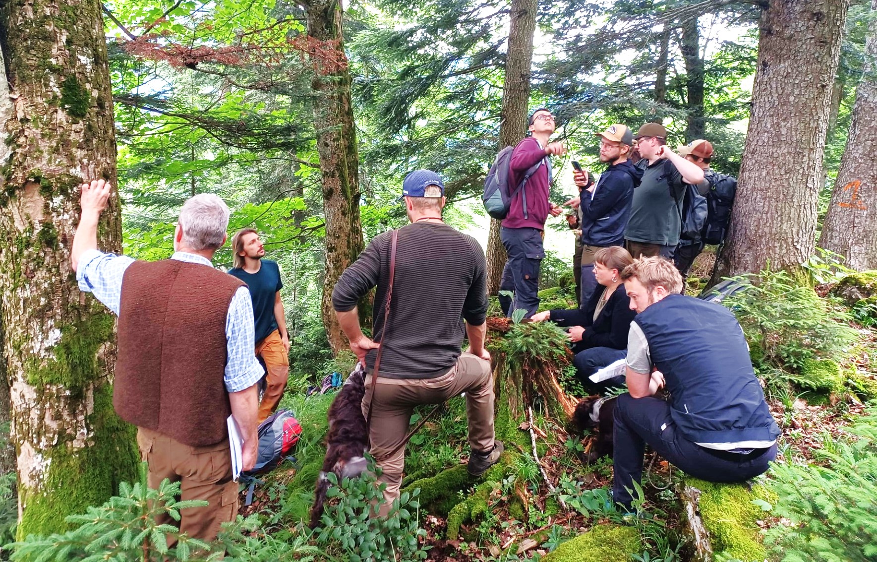 Das Foto zeigt eine praktische Übung zur Bestandsaufnahme und Nachweissuche im Auerhuhn-Lebensraum …