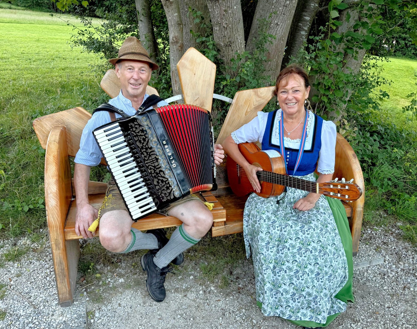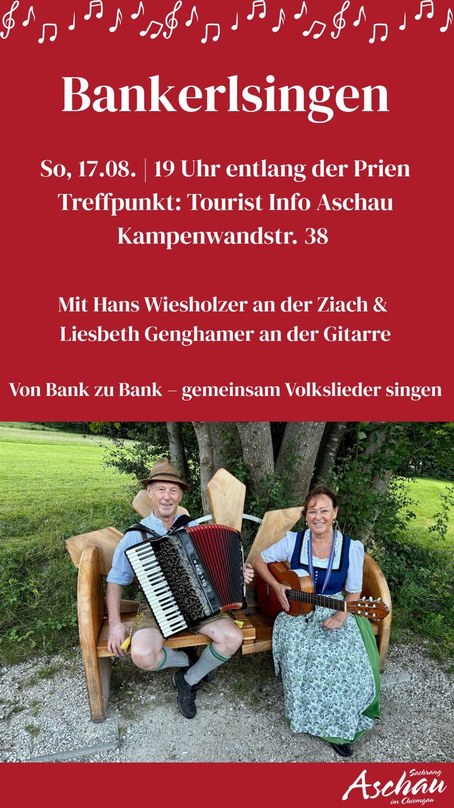 Nach dem erfolgreichen Auftakt im Frühjahr findet am kommenden Sonntag, 17. August, erneut ein „Bankerlsingen“ in Aschau im Chiemgau statt. Hans Wiesholzer an der Ziach und Liesbeth Genghammer an der Gitarre (Foto) stimmen wieder Lieder zum Mitsingen an. Gemeinsam mit allen singfreudigen Teilnehmern werden alpenländische Weisen gesungen.