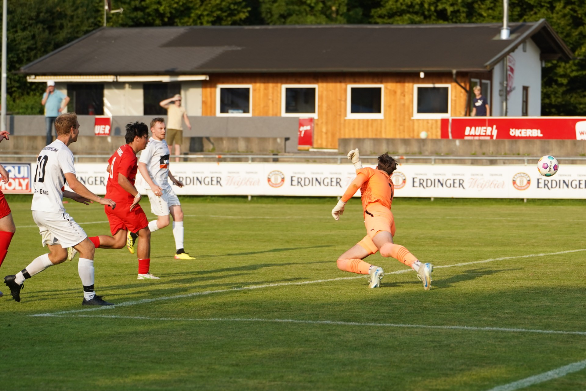 Die Buchbacher U23 setzte weiter Nadelstiche und nach einem Foul an Lorenz Grill im Strafraum ertönte der der Elfmeterpfiff. Johannes Schmauser verwandelte sicher zum 1:0 für Buchbach (40.). Auf der Gegenseite wurde ein Schuss von Matthias Vital von Manuel Mattera auf der Linie geklärt (45). Kurz vor dem Pausenpfiff schlugen die effektiven Buchbacher noch einmal zu. Nach einer Ecke von Adiran Alexy köpfte Spielertrainer Stefan Perovic unbedrängt zum 2:0 für die jungen Hausherrn ein (45+2.).