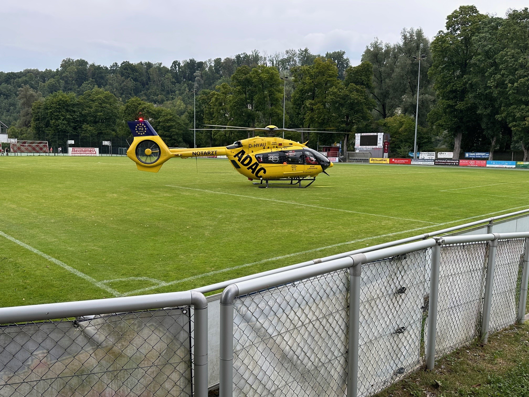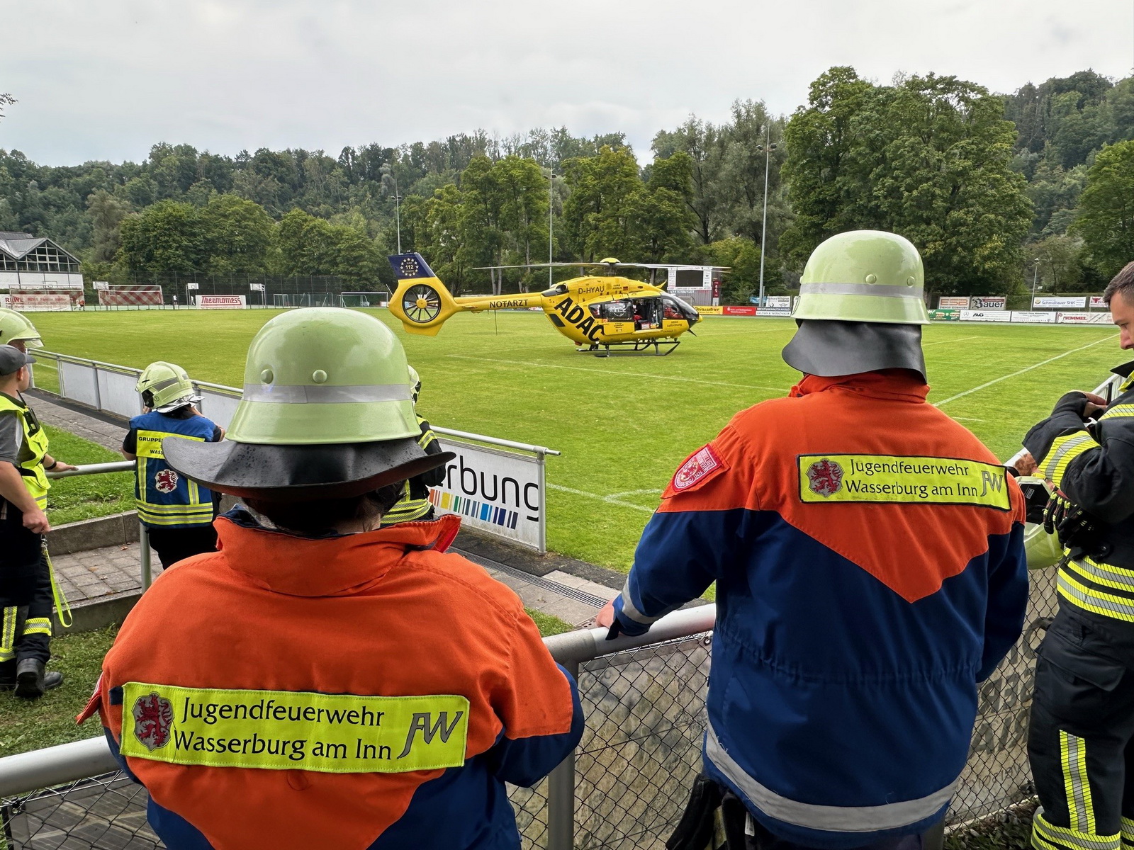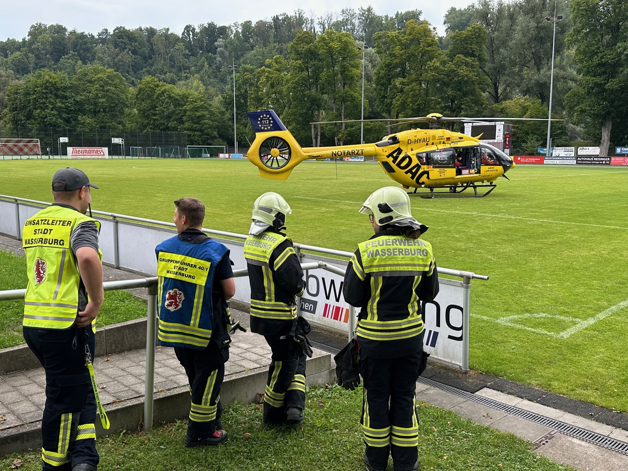 Einsatz für die Feuerwehr Wasserburg am Mittwochnachmittag: Ein medizinischer Notfall machte gegen 17 Uhr die Landung eines Rettungshubschraubers in der Wasserburger Altstadt notwendig. Der Helikopter landete auf dem Sportplatz an der Landwehrstraße. Die Wasserburger Feuerwehr sicherte den Landeplatz ab. Fotos: Georg Barth