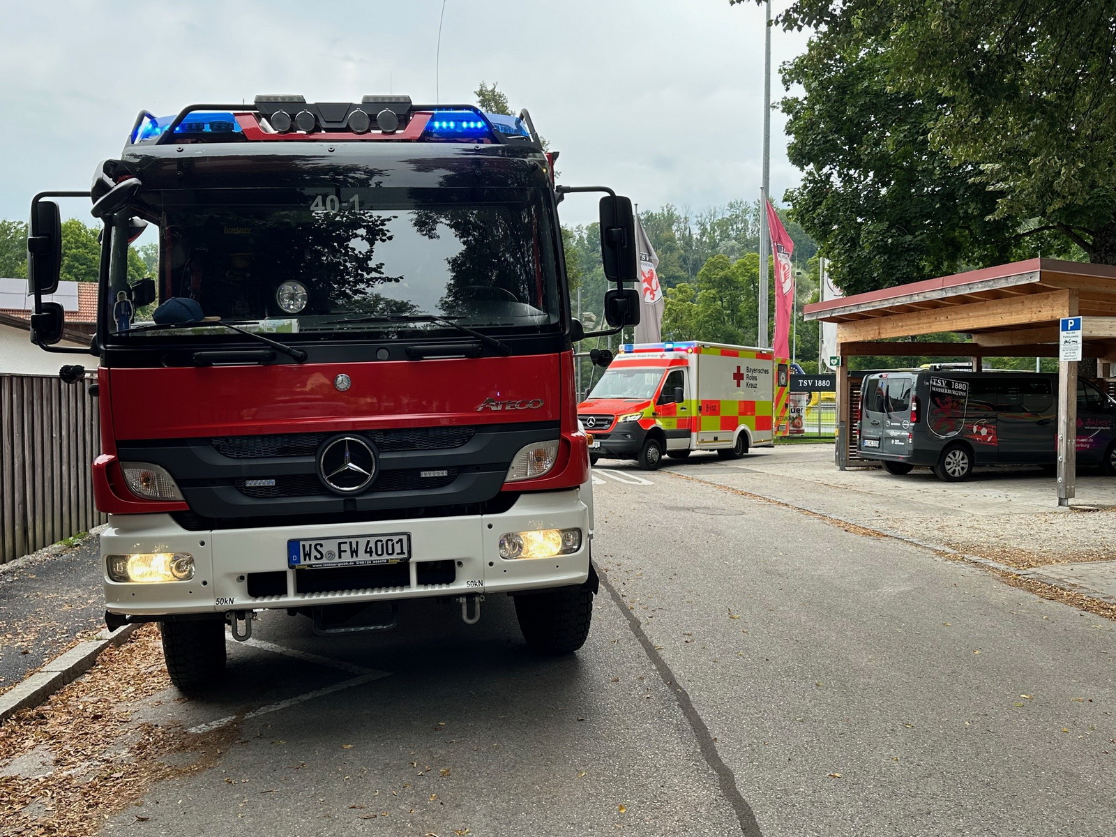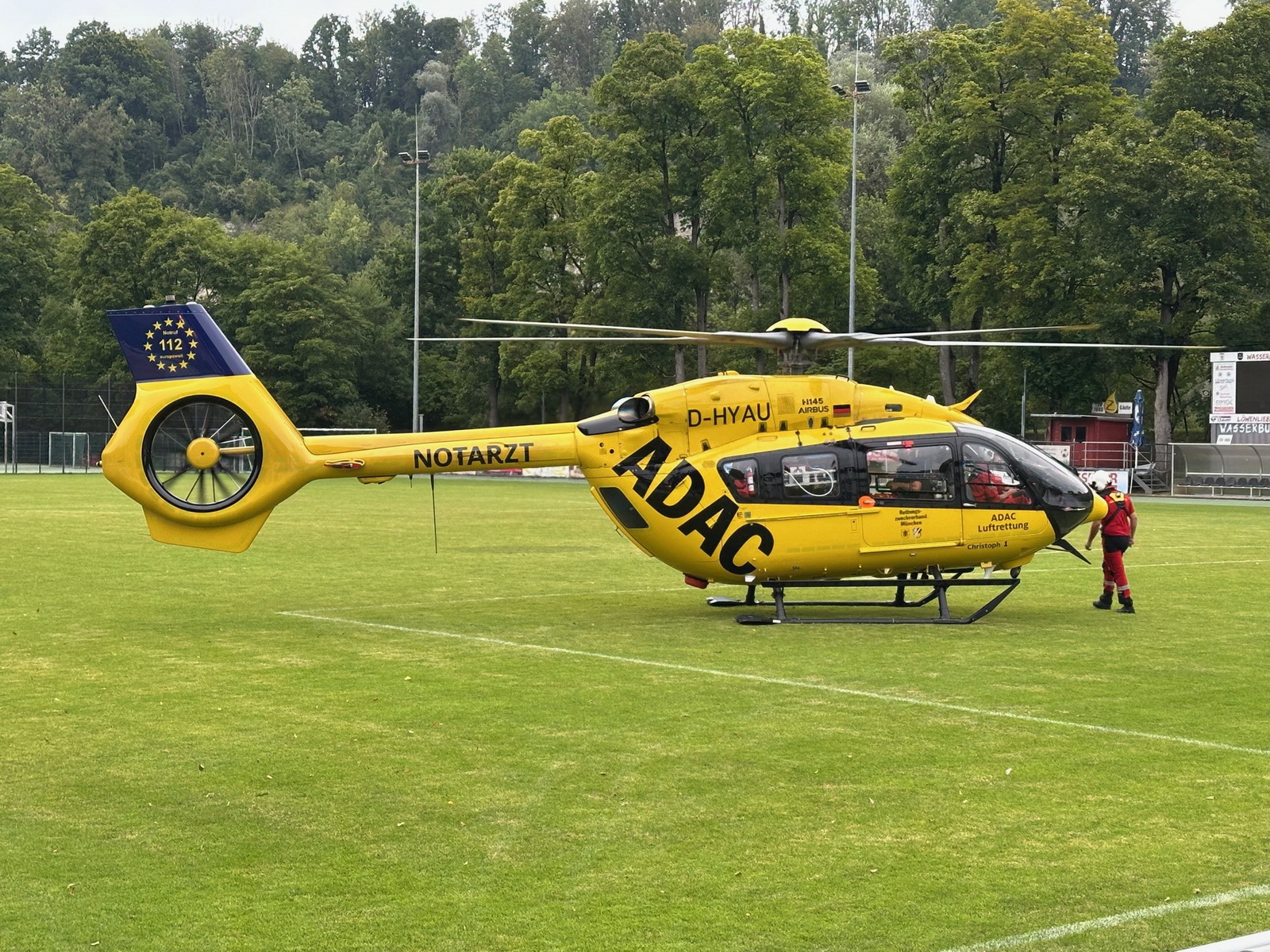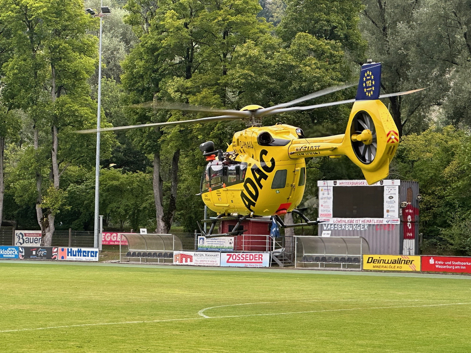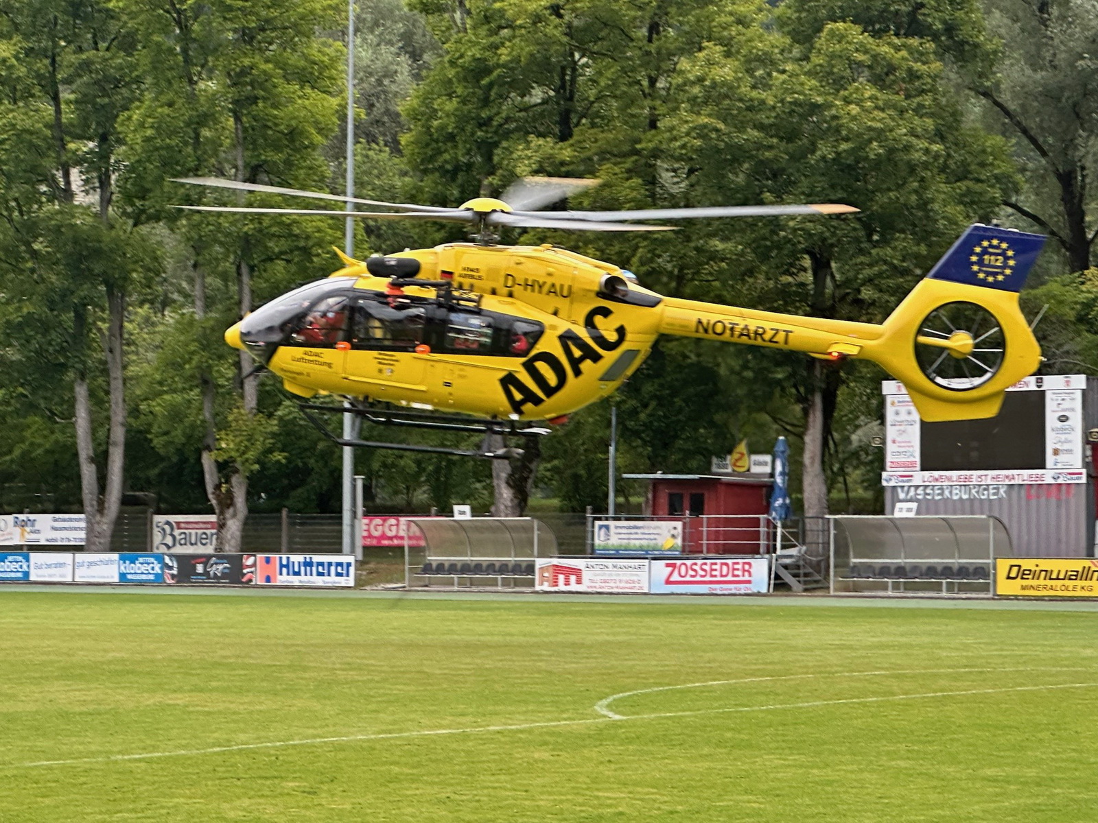 Einsatz für die Feuerwehr Wasserburg am Mittwochnachmittag: Ein medizinischer Notfall machte gegen 17 Uhr die Landung eines Rettungshubschraubers in der Wasserburger Altstadt notwendig. Der Helikopter landete auf dem Sportplatz an der Landwehrstraße. Die Wasserburger Feuerwehr sicherte den Landeplatz ab. Fotos: Georg Barth