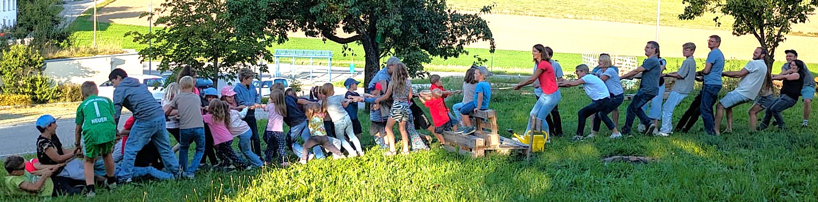 Gleich zu Beginn forderten die Kinder die Erwachsenen zu einem großen Seilziehen heraus – siehe Foto. Unter lautem Anfeuern entschieden die jungen Gäste den Wettkampf klar für sich. Danach knisterte das Lagerfeuer, an dem Stockbrot gebacken wurde, während es für alle zusätzlich Würstl-Semmeln gab. Auch jede Menge der reifen Äpfel von den alten Obstbäumen fanden in kleingeschnittener Form reißenden Absatz.