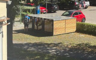 Drei große Boxen aus Holz, Glas und Aluminium sorgen für einiges Aufsehen und Neugierde