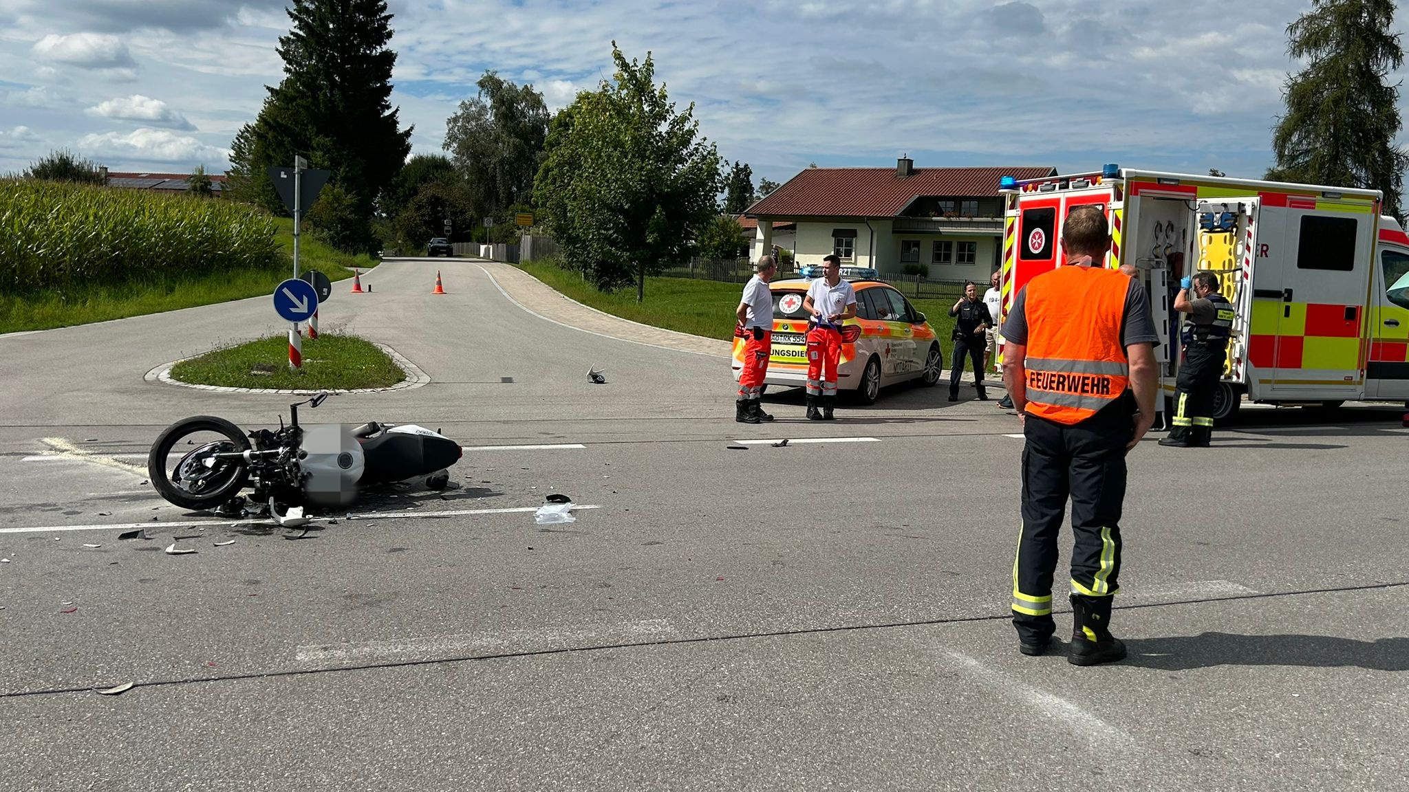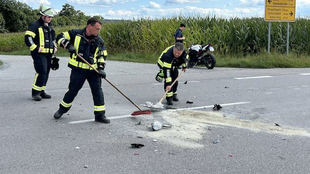 Alarm für die Feuerwehr Evenhausen am Montagnachmittag: Gegen 14.20 rücken die Floriansjünger zu einem Verkehrsunfall auf die Kreisstraße RO35 in Richtung Stephanskirchen aus. Dort ist an einer Kreuzung eine Motorradfahrerin verunglückt. Auch der Rettungsdienst und die Polizei sind im Einsatz. Ein Notarzt wurde angefordert. Ersten Meldungen nach hat ein Pkw-Fahrer die Zweiradfahrerin beim Abbiegen übersehen. Polizeibericht folgt. Die Motorradfahrerin kam ins Krankenhaus. Fotos: RB